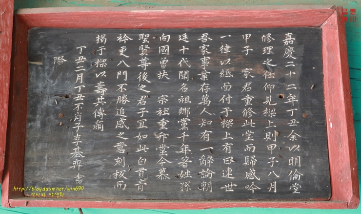 가경嘉慶22년 정축丁丑(1817)년에 내가 명륜당 수리 책임을 맡고 들보 위를 올려보니 갑자년 8월 갑자에 가군家君께서 이 명륜당을 중수하고 돌아가시며 율시 한 수를 읊어 종이를 들보 위에 써 붙였는데 거기에 대를 이은 우리 집안 사업이 있나니 만인이 같은 말로 논하는지 알지로다.