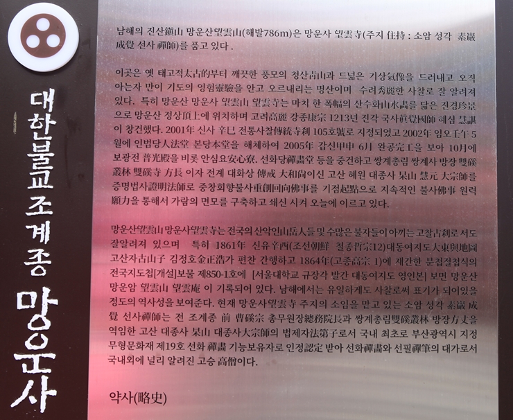 남해에 문중 재실이 있는지 알아보고 겸해서 우리나라에서 가장 높은 곳에 있다는 망운산봉수대를 찾으러 갔다가 찾지 못하고 예전에 영상으로 봤던 망운사望雲寺를 찾았다.