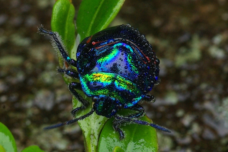 곤충의 몸 색상이 금속성 광택이 나며 보라빛을 띤 홍색의 무늬가 매우 아름다운 곤충으로 몸길이는 17~19mm 이다. 성충은 보지 못했고 이 사진의 주인공은 약충이라 한다. 주로 숲에서 살며 식물의 즙을 먹으며, 회양목·등·참나무·식나무·층층나무·노린재나무의 열매 등에서 채집할 수 있다고 한다.