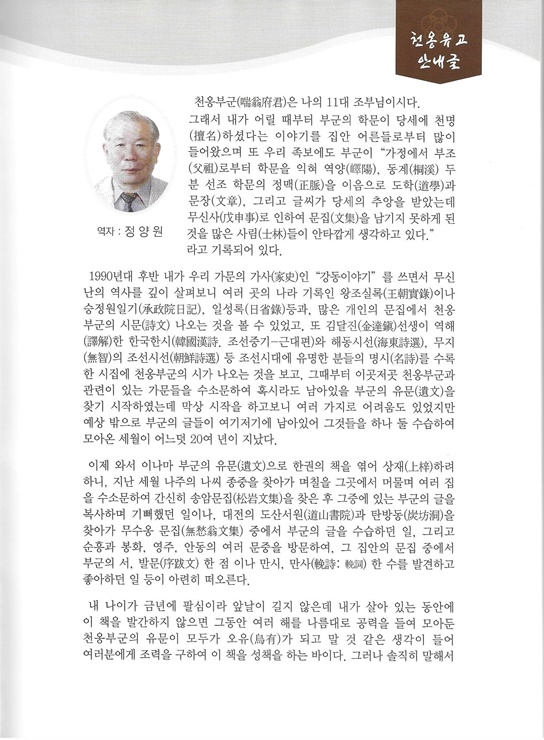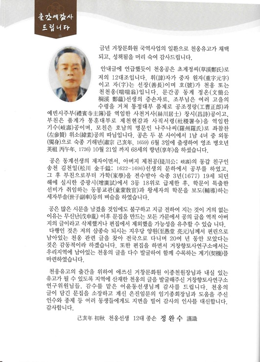거창문화원 선현문집 제8집 『국역 천옹유고 國譯 喘翁遺稿』는 초계정씨草溪鄭氏 천천옹喘喘翁 정중원鄭重元(1659~1726)의 글을 그의 11세손 정양원鄭亮元이 외가와 천천옹喘喘翁의 처가 등에서 천천옹喘喘翁의 글을 찾아 모아 국역해 만든 책이다.