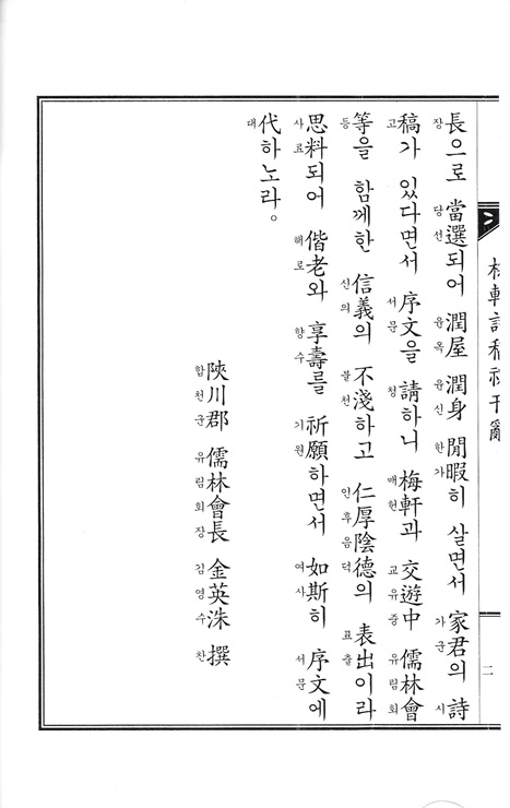 『매헌시고 梅軒詩稿』는 합천 가회면 두심에서 1930년에 태어난 매헌梅軒 이봉섭李鳳燮의 시詩를 모아 김영수金英洙의 서문序文과 권병석權丙錫의 축간사, 이봉섭李鳳燮의 자서自序와 김학수金學洙의 발跋을 부쳐 그 아들 이광희李光熙가 2017년 8월에 한림인쇄사에서 2권 1책으로 발간했다.