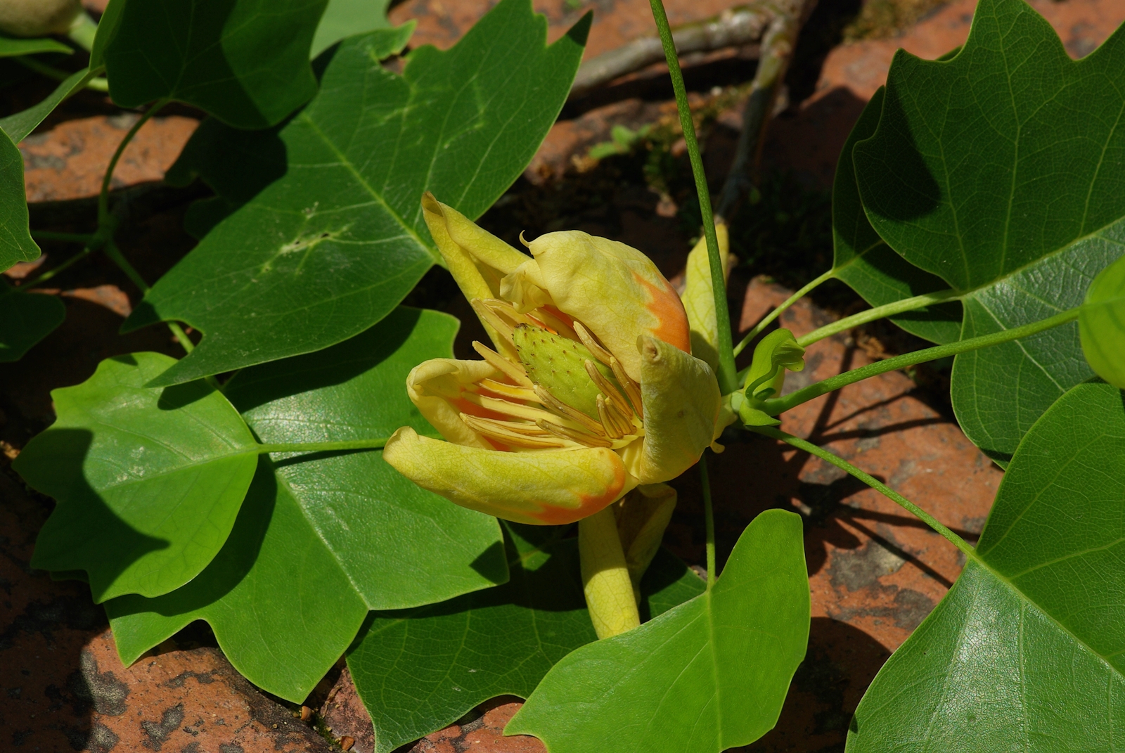 꽃은 4월 말경에 피고 가지 끝에 1송이씩 달리는 오랜지색 6개의 꽃잎이 아름답다. 10월에 6-7㎝크기의 열매가 익고 열매 1개에 종자가 1-2개 들어 있다. 구과상으로 모여 바로 선다.