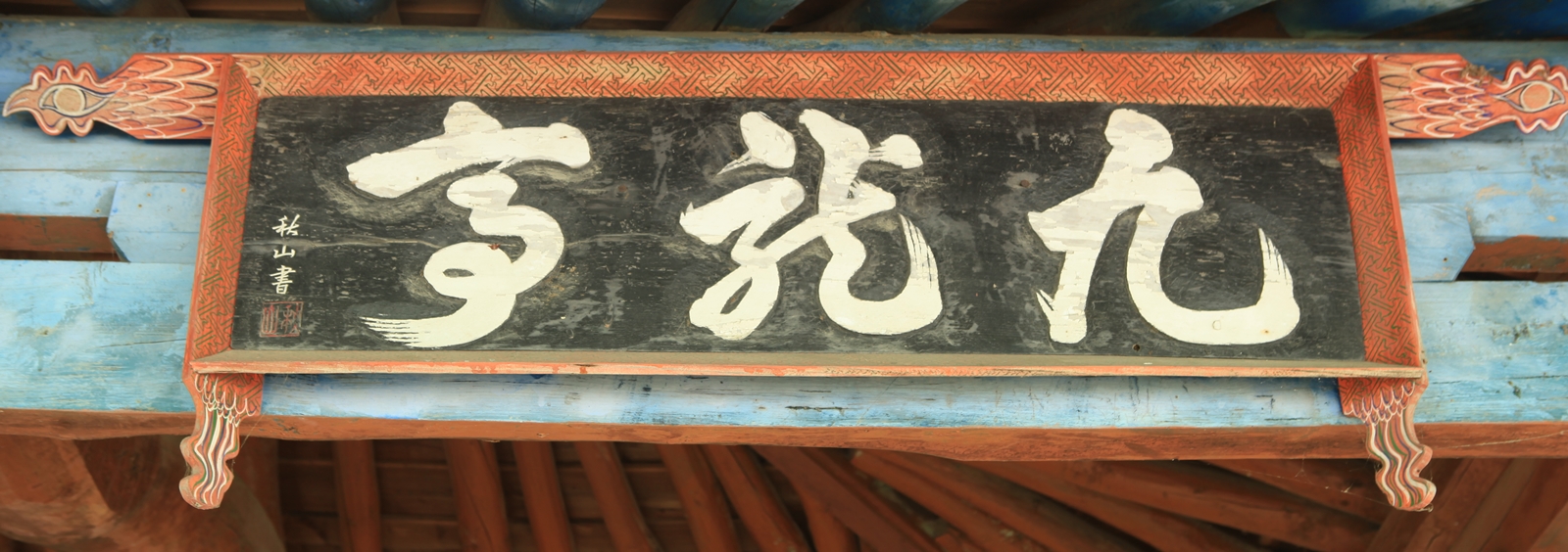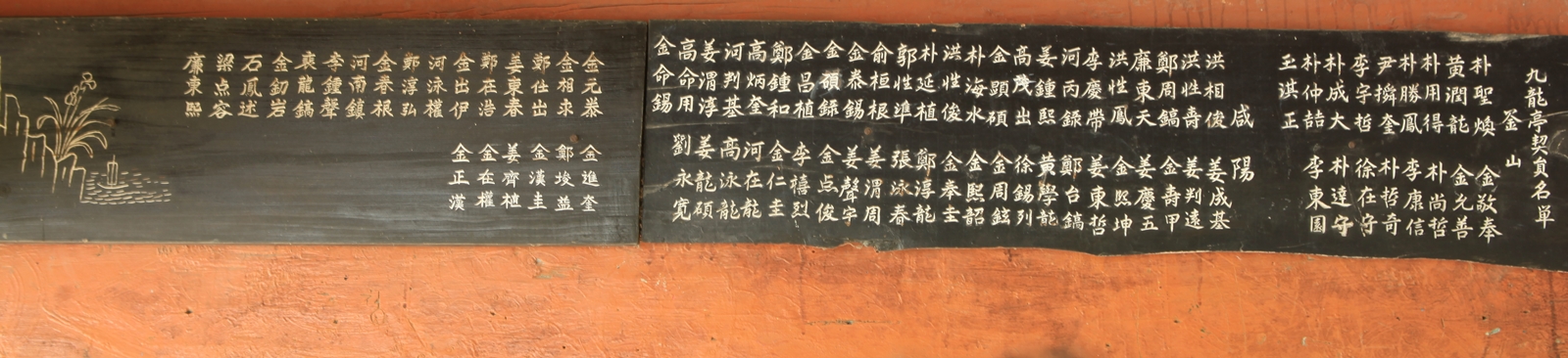 무신戊申년에 부산·함양 두 지역의 뜻있는 신사紳士⁵⁾들이 합심하여 계契를 만들어 재물을 모아 정자亭子를 세웠다. 그로 인하여 그 못을 일컫기를 구룡九龍이라 이름하고 풍욕風浴하고 시詩 짓고 읊기를 한해 한번씩 개최하니 산은 더욱 높고, 물은 더욱 맑도다. 많은 계원契員이 마음을 모아 노력하였으나 부산의 김경봉金敬奉, 이강신李康信, 황윤용黃潤龍 등과 함양의 김희곤金熙坤, 고무출高茂出 등 두 분이 특히 노력하였다. 어느날에 김희곤金熙坤, 김수갑金壽甲 두 사람이 나에게 와서 그 전말顚末을 상세히 말하고 한마디 편미扁楣⁶⁾를 청하거늘 내가 여러번 사양하였는데도 불구하고 위와 같이 간략하게 지으니 원컨대 계원契員은 더욱 앞의 뜻을 가담듬어 선현의 발자취를 흠양하고 여생의 견문을 열어 이 계와 이 정자로 하여금 국내에 드날리고 용이 구천에 나는 것과 같이 오직 이곳의 영광뿐 아니라 장차 내세來世에도 도움이 있으리니 힘쓸지어다.