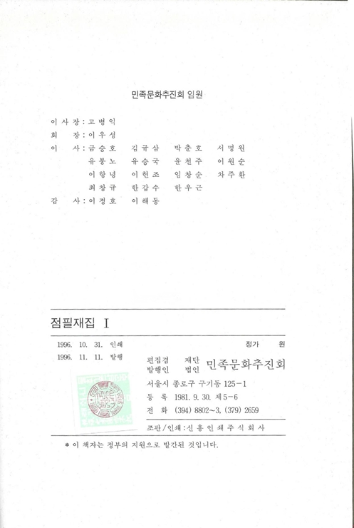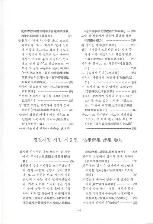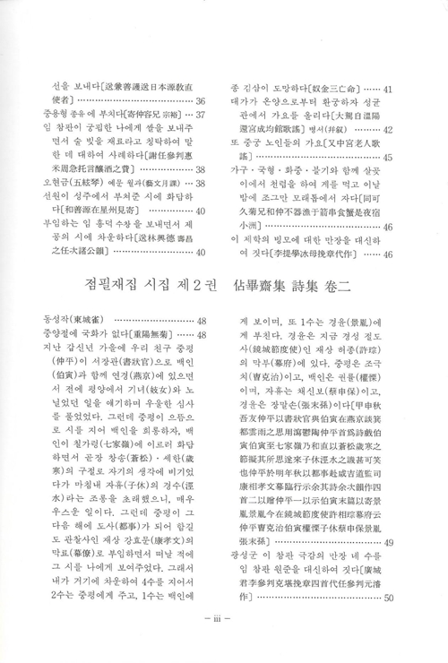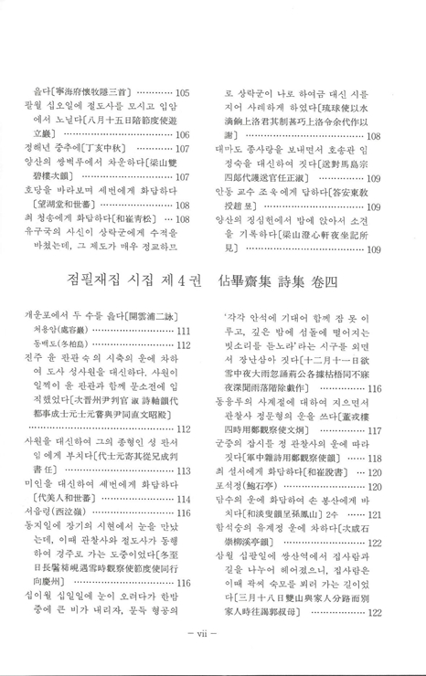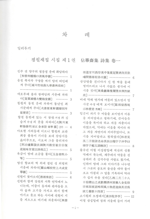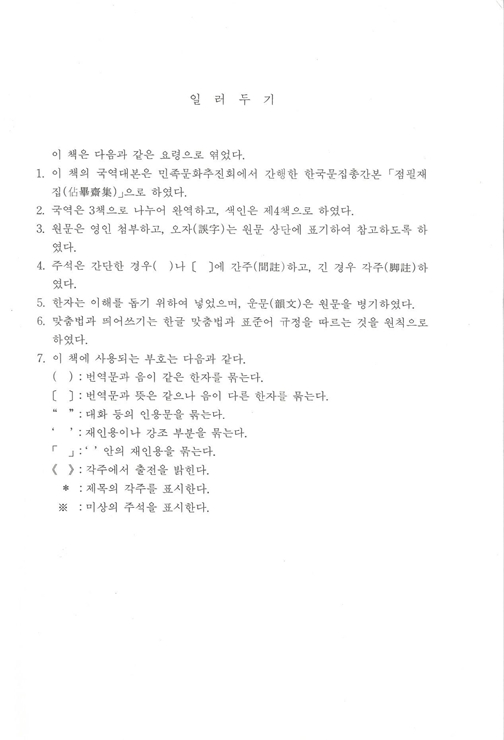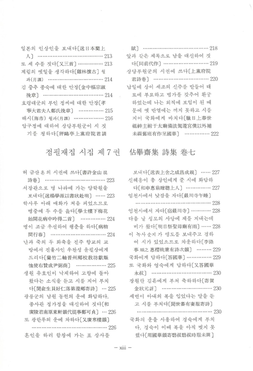 『국역 점필재집 佔畢齋集』은 전 3책으로 점필재佔畢齋 김종직金宗直(1431~1492)이 죽은 다음 해 1493년에 제자 조위曺偉에 의해 편집된 25권 7책의 목판본을 시작으로 1497년, 1520년, 1977년 영인본까지 발간된 책을 임정기가 한글 번역하여 1996년 11월 재단법인 민족문화추진회에서 발행한 3책이다.