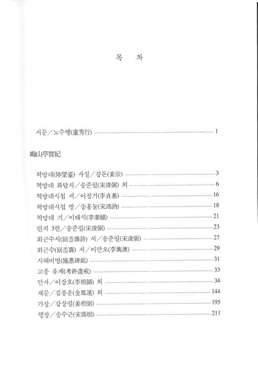 책의 권두에 1964년 10월 사위 노수행盧秀行의 서문序文이 있고, 강돈姜潡의 ‘척망대陟望臺 사실’과 여러 제현들의 화답시로 시작해 말미에 강상필姜相弼의 발문跋文과 강가조姜家祚의 국역간행 후기를 부쳐 간행되었다.