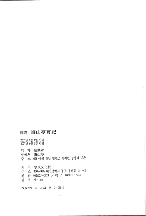 이 책은 2021년 8월 합천군 쌍책면 성산리 559에 위치한 회산정晦山亭을 방문했을 때 회산정을 관리하는 안주인의 배려로 소장하게 됐다.