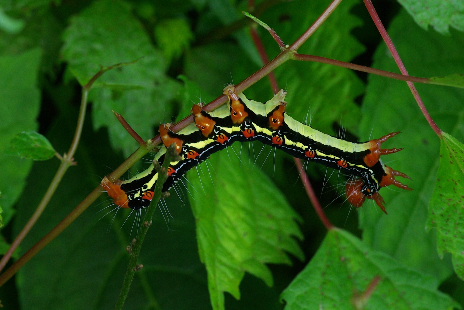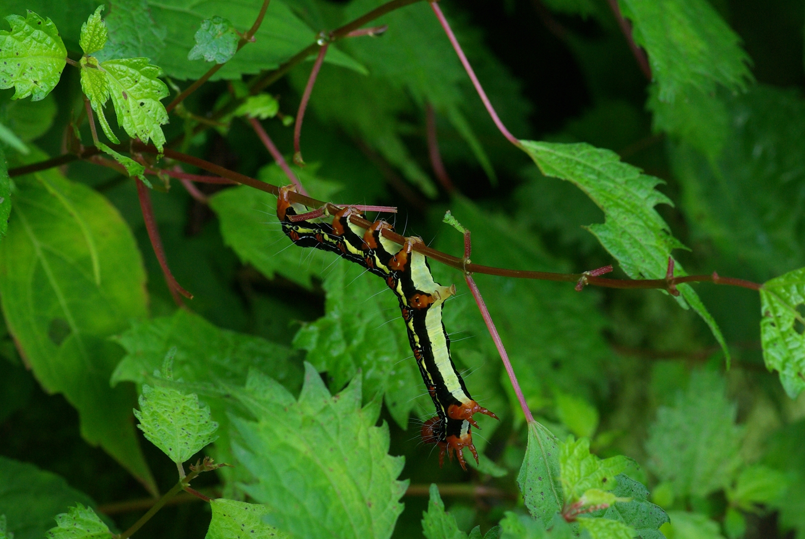 불모산에서 정자 사진과 단풍취의 꽃 핀 모습을 담아보기 위해 갔었는데 사진은 담았지만 단풍취의 꽃 핀 모습은 찍어보지 못했다. 단풍취가 밀집해서 있는 곳을 대략 살폈으나 꽃은 보지 못했고 다른 곳에서는 꽃은 없고 대만 남아있는 것만 보았다. 단풍취 꽃은 보지 못했지만 대신 암청색줄무늬밤나방 애벌레의 사진을 찍을 수 있었다. 애벌레의 이름은 페이스북 친구 박경숙이 알려 줬다.
