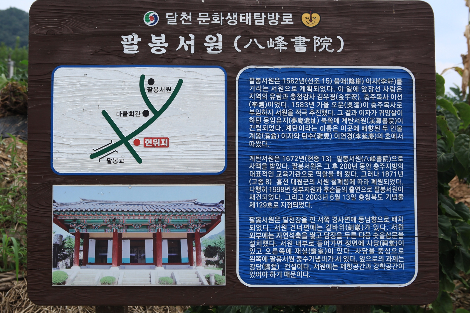 충주시 대소원면 문주리 74-1에 위치한 팔봉서원八峰書院은 연산군 축출 이후 진보적 사림파가 중앙 정계에 진출했다가 기묘사화己卯士禍(1819) 때 극형을 당하거나, 귀양 갈 때, 이곳으로 귀양 온 계옹溪翁 이자李耔(1480~1533)와 충주 용탄龍灘으로 낙향한 탄수灘叟 이연경李延慶(1484~1548)이 거룻배를 타고 서로 교유交遊하며 시문을 남기고 풍류를 즐긴 회심會心의 장소이다. 이 두 인물을 기리고자 1582년 봄 충청감사 김우굉金宇宏(1524~1590), 충주목사 이선李選(1522~1586), 지방 유림이 토계에 서원을 건립하고 그 이름을 계옹溪翁의 ‘계溪’와 탄수灘叟의 ‘탄灘’을 한자씩 따와 계탄溪灘이라 불렀다. 이로써 충주 최초의 서원인 계탄서원溪灘書院의 시대가 시작되었다.