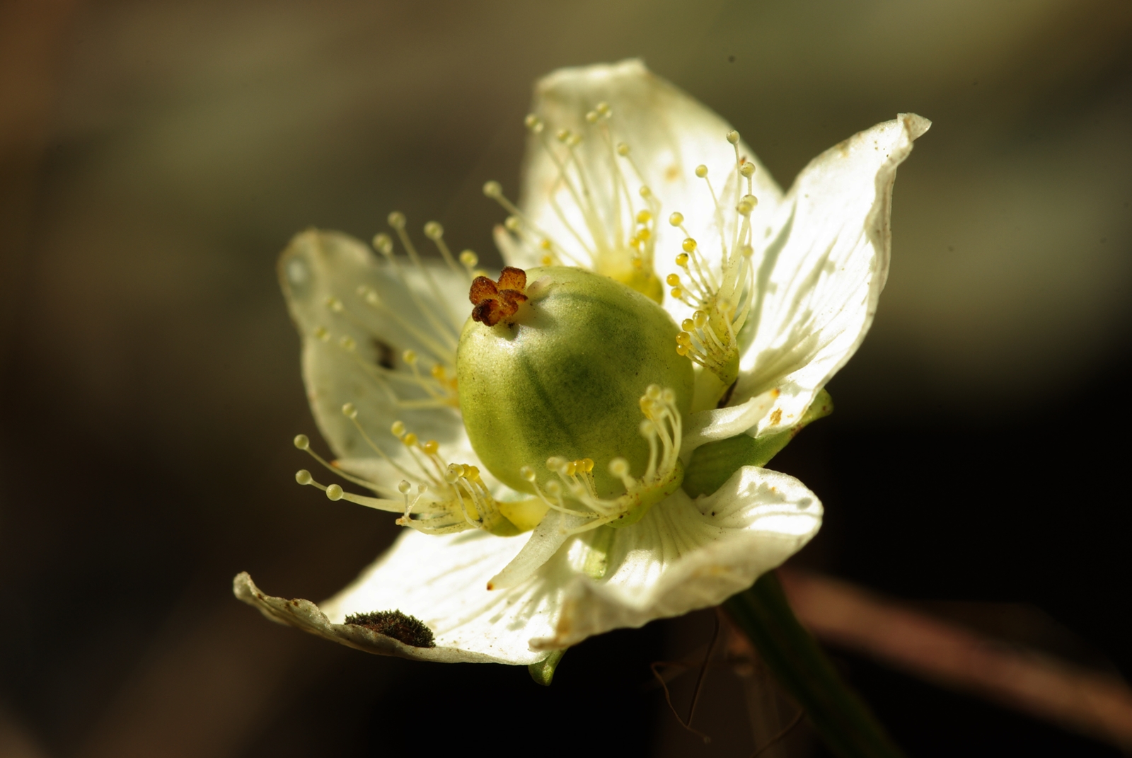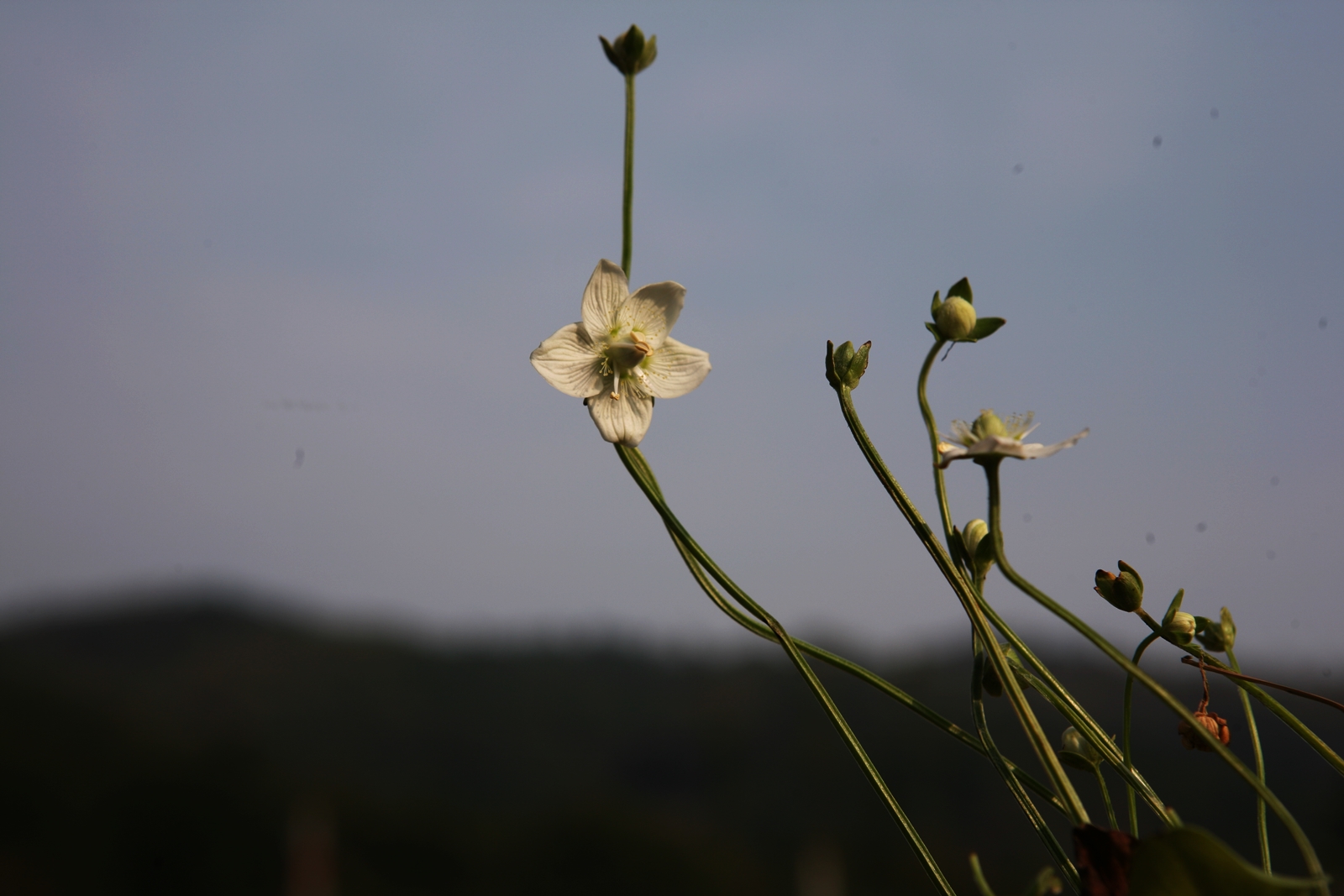 우리나라가 원산이며 전국의 비교적 높은 산 습기가 많은 풀밭에 자라는 여러해살이풀이다. 꽃줄기는 뿌리에서 여러 대가 나며 높이 20-40cm다. 뿌리에서 난 잎은 잎자루가 길고 잎몸은 둥근 심장 모양이다. 줄기잎은 보통 1장이며 밑이 줄기를 반쯤 감싼다. 꽃은 8~10월에 1개씩 달리며 흰색, 지름 2~3cm다. 꽃잎은 5장이며 둥근 난형이다. 수술은 5개이다. 헛수술은 5개이며 12~22갈래로 실처럼 갈라지고 각 갈래 끝에 둥글고 노란 꿀샘이 있다.