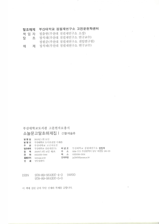 『소눌문고탈초해제집1』은 소눌小訥 노상직盧相稷(1855~1931)의 간찰簡札과 제술製述을 탈초脫草 하고 해제를 달아 부산대학교 점필재연구소 고전문헌학센터에서 2013년 1월에 발간한 책이다.