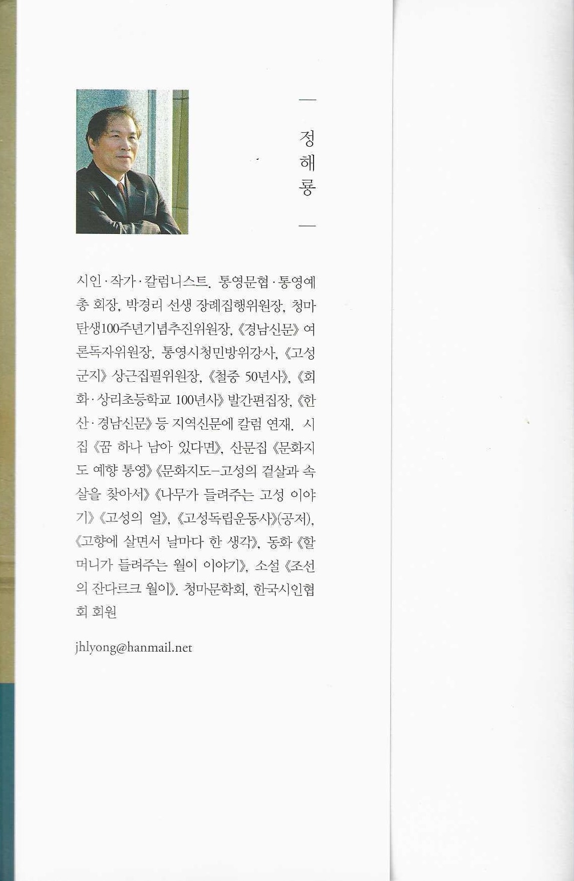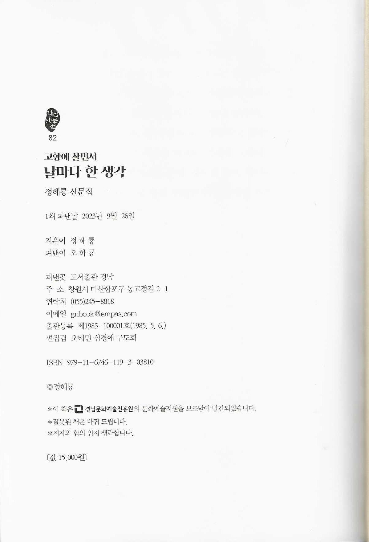 『고향에 살면서 날마다 한 생각』이라는 제목의 책은 경남 고성 출신 시인이면서 작가로 활동하는 정해룡(丁海竜) 통영문협회장이 지방 신문사에 투고한 산문을 추려서 엮는 산문집이다.
