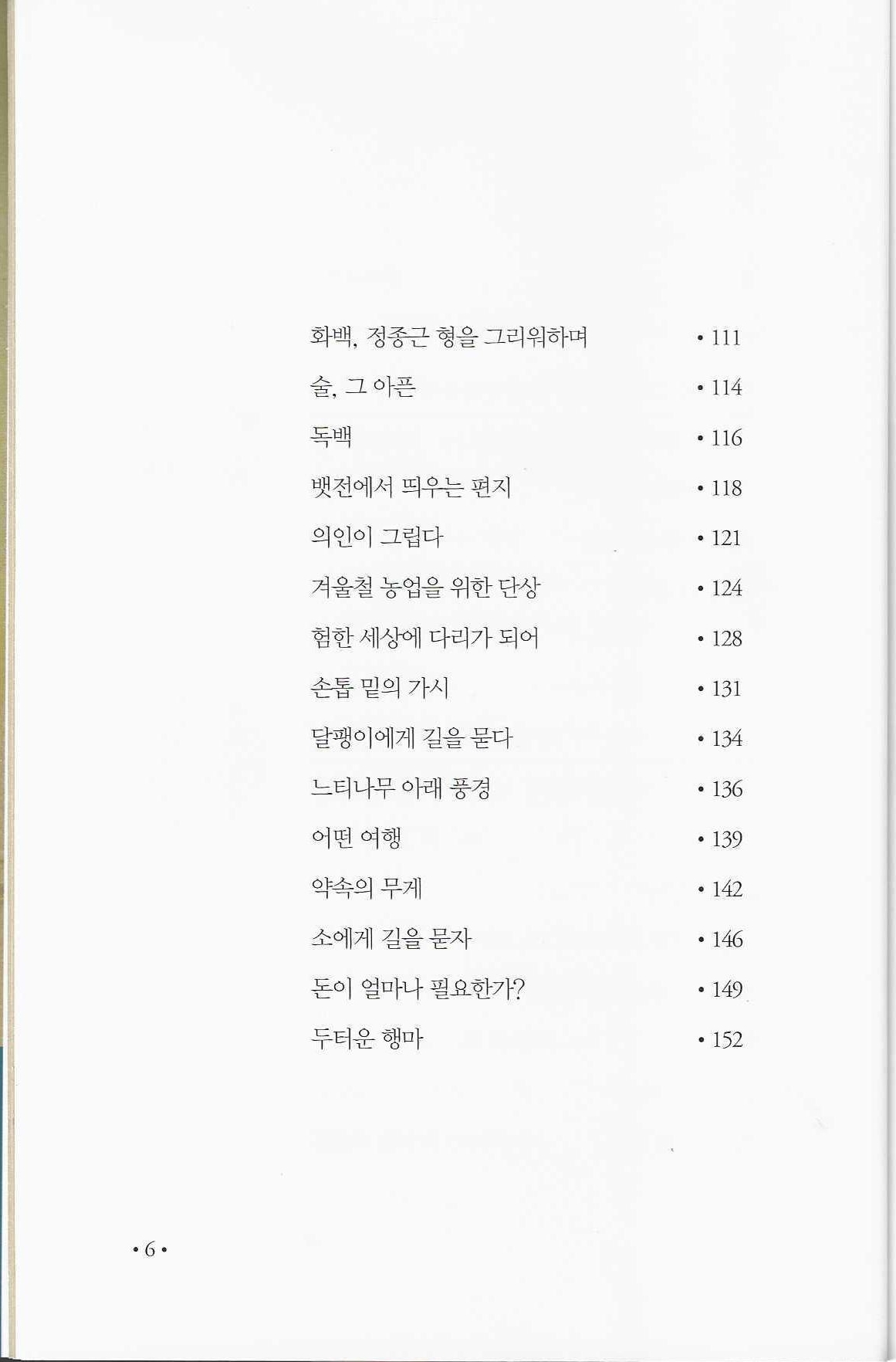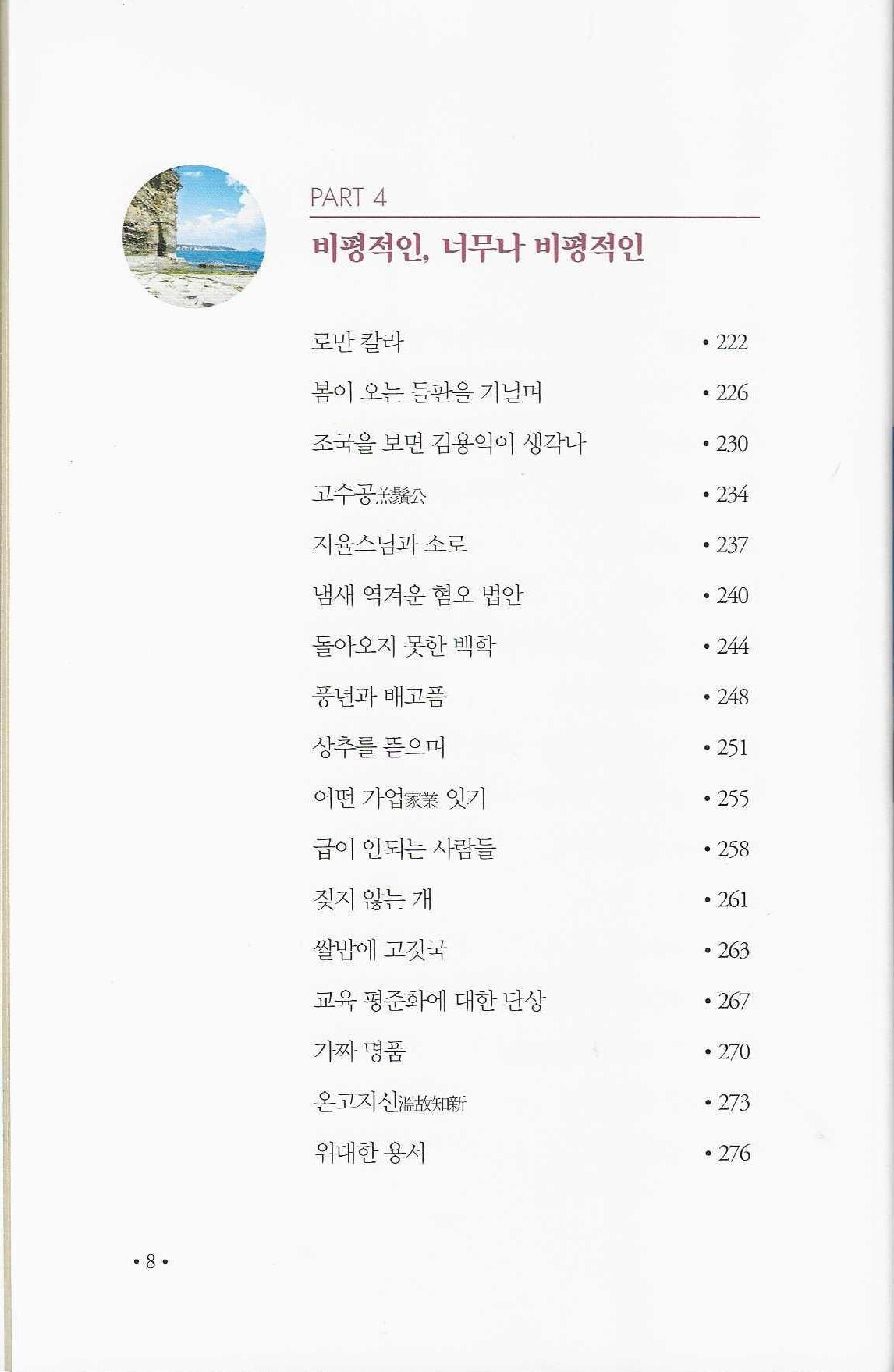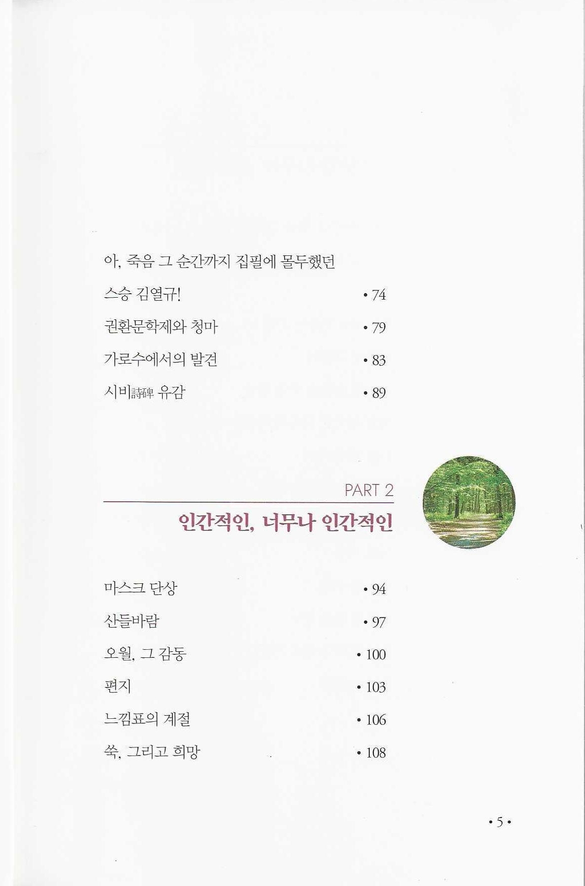 차례는 크게 문예·인간·감성·비평 등 4부분으로 나누고 세목을 달았다.