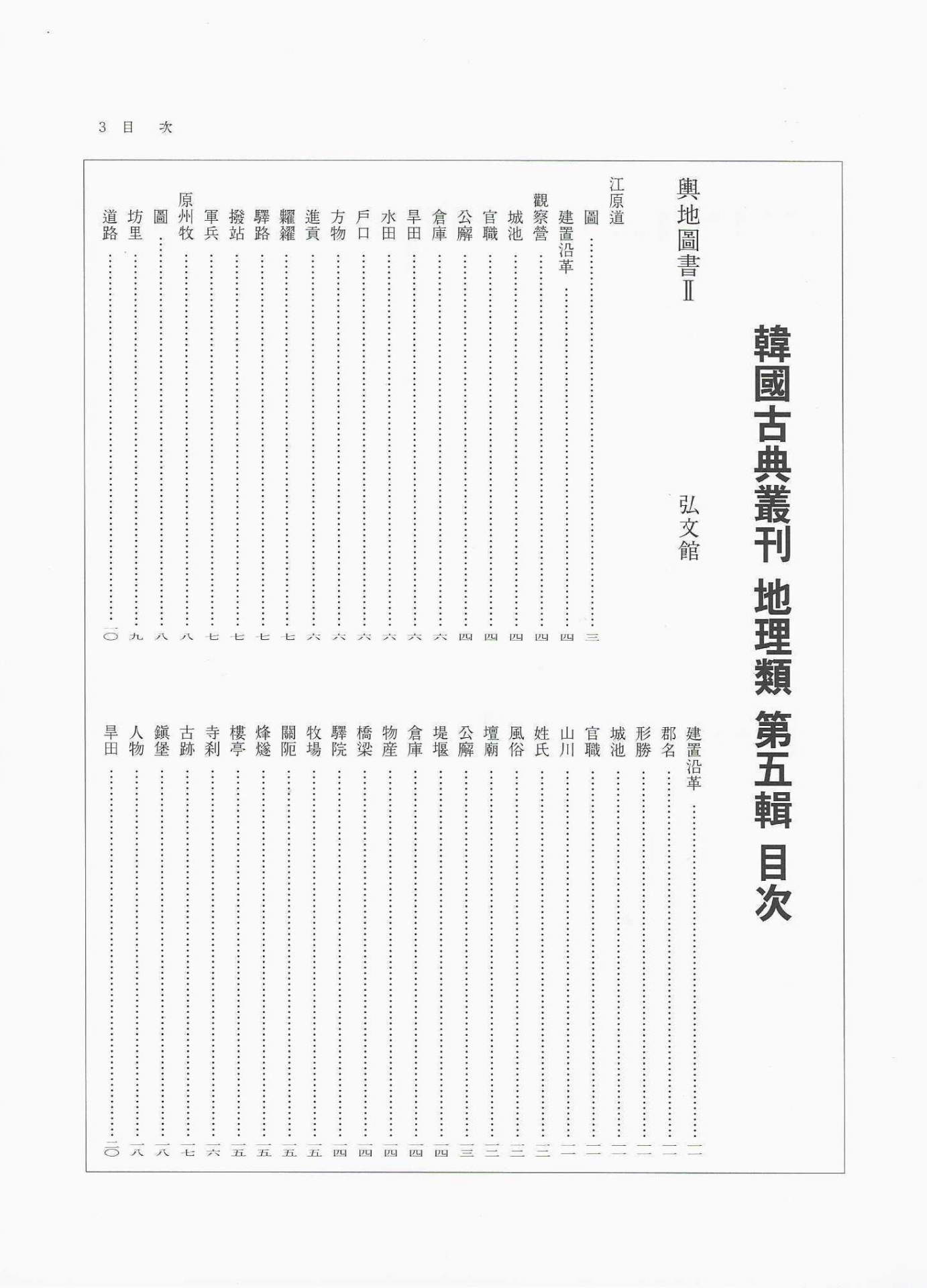 『影印 韓國古典叢刊_地理類5_영인 한국고전총간_지리류5』는 江原道(강원도), 黃海道(황해도), 平安道(평안도)의 지리를 조선시대의 방식으로 정리하여 기록한 책이다.