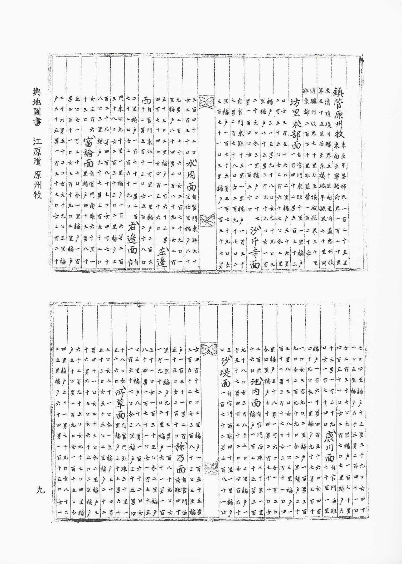 城池(성지), 官職(관직), 公廨(공해), 倉庫(창고), 旱田(한전), 水田(수전), 戶口(호구). 方物(방물), 進貢(진공), 糶糴(조적), 驛路(역로), 撥站(발참), 軍兵(군병)