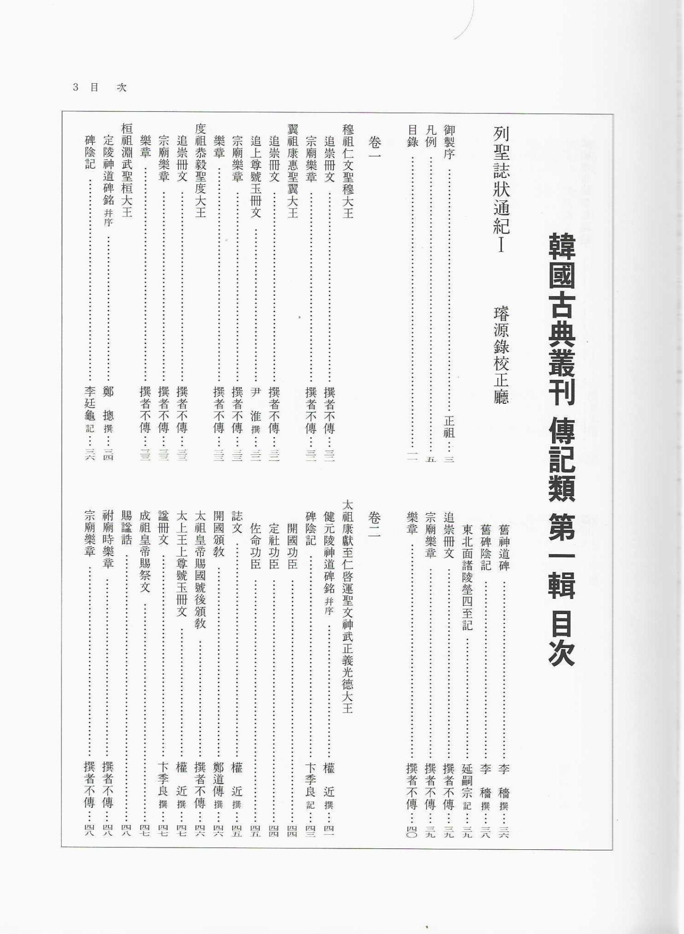 列聖誌狀通紀1(열성지장통기1)의 복사본을 싣기 전 권두에 『영인 한국고전총간』을 발행하는 편찬인명록을 붙이고 총목차와 범례를 달았다.