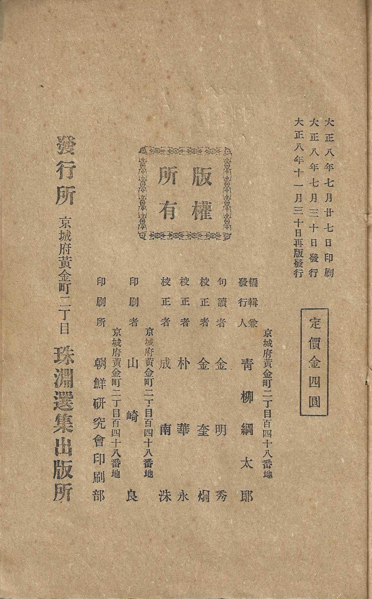 겉 표제는 한지이고 내부는 소위 똥조~로 인쇄했다. 내용을 보니 <고종(조선제26대왕) 어찬「高宗(朝鮮第26代王) 御撰」>으로 대정8(大正8;1919)년 11월 30일 재판 발행한 것으로 편집 발행인이 왜구(倭寇) ‘아오야나기 고타로(靑柳綱太郞)’이다. 책 제목인 주연(珠淵)은 고종(高宗)의 호이다.