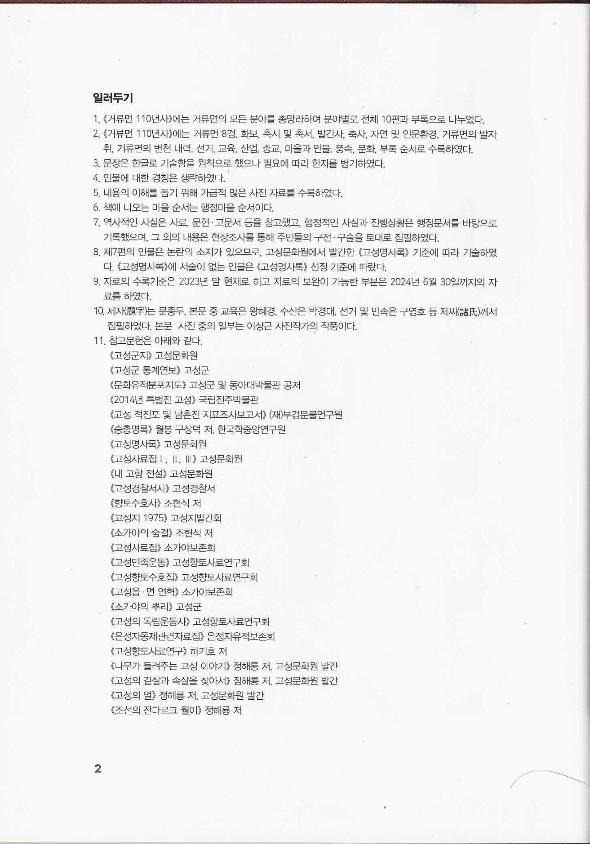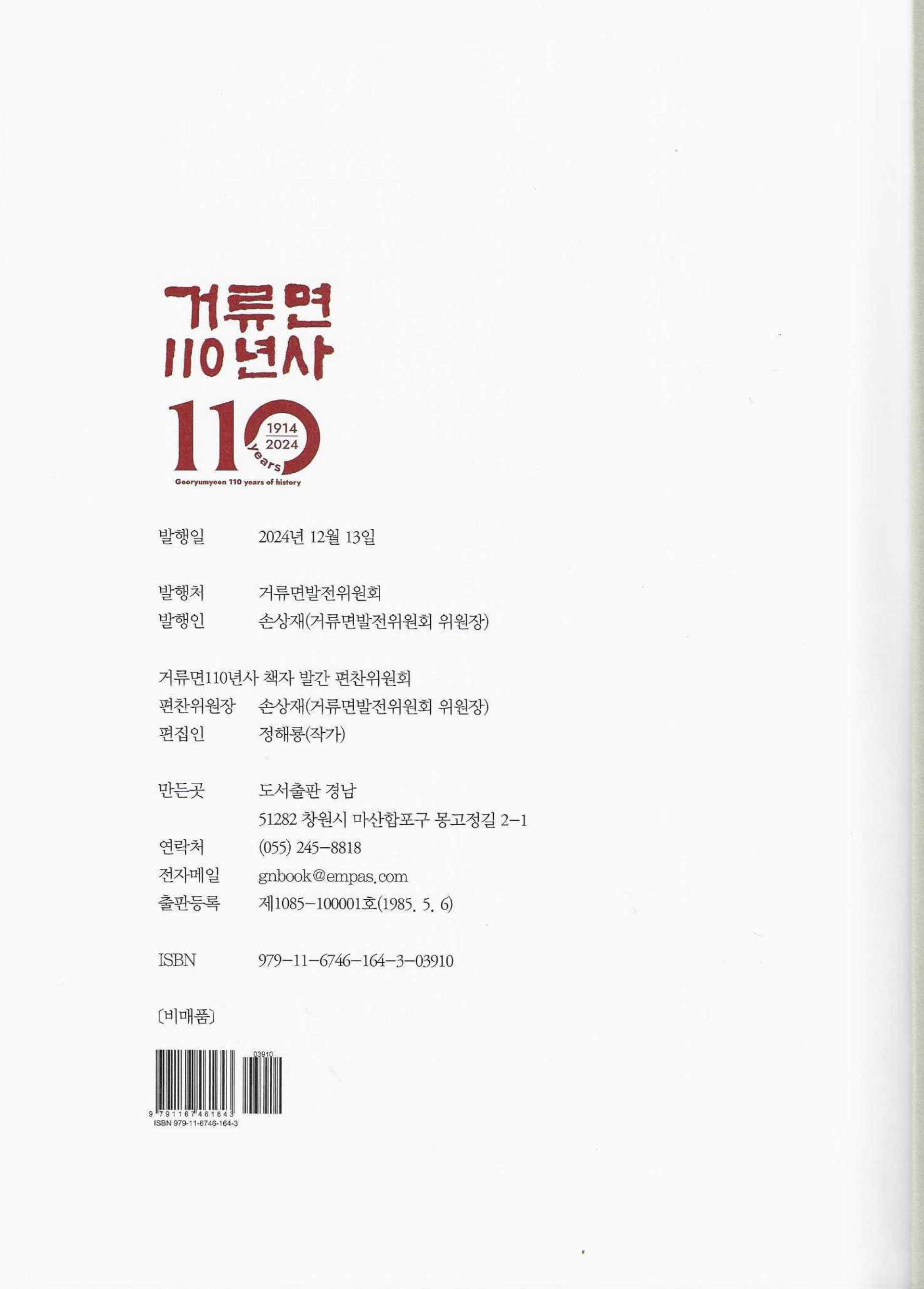 『거류면110년사』는 1914년~2024면까지 고성군 거류면의 모든 문화와 역사를 기록한 책으로 거류면발전위원회가 발행하고, 위원장 손상재를 발행인으로 하여 2024년 12월 13일에 발간했다. 편집은 정해룡 작가가 했으며, 출판사는 「도서출판 경남」에서 인쇄 발행했다.