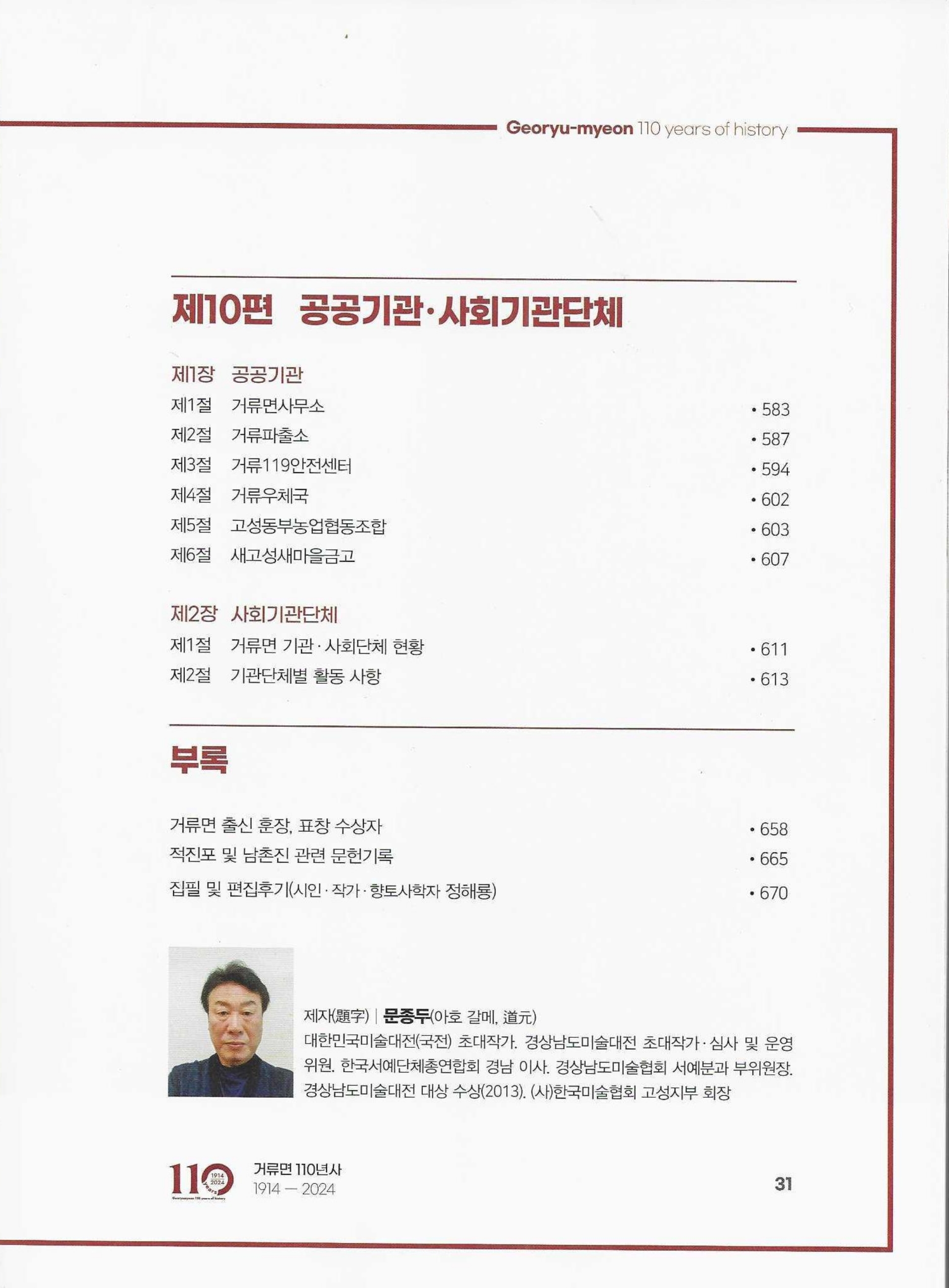 차례의 목록 뒤편에 「사진이 들려 주는 거류면 10년의 역사」 싣고, 용산리 출신 조정재 시인의 “거류 110년을 맞아”라는 축시를 붙이고, 정창석 한학자의 한시를 비롯해 서예가 방덕자의 서예와 송산리 거주인 최옥희의 ‘정도전의 시’를 서예로 남겼다.