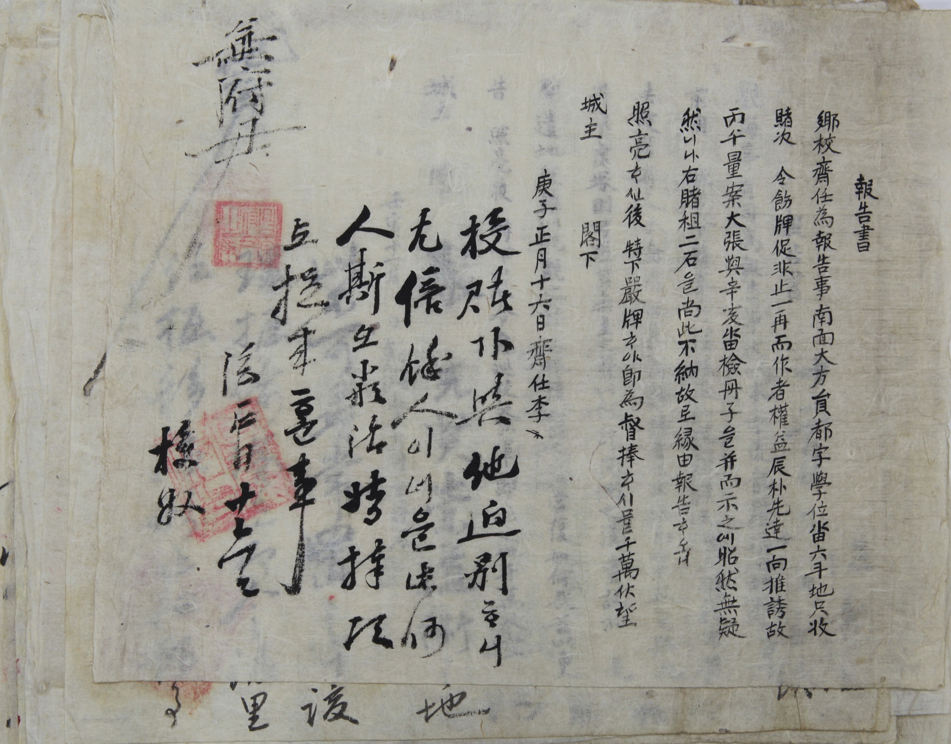 鄕校齋任爲報告事 南面大防員都字 學位沓六斗地只 收賭次 令節牌促非止一再 而作者權益辰 朴先達 一向推誘 故丙午量案大帳 奧辛亥踏驗 丹子을 幷而示之에 昭然無疑然니다 右賭租二石을 尙此不納故로 緣田報告事오니 照亮ᄒᆞ신後 特下嚴牌ᄒᆞ야 卽爲督捧ᄒᆞ시뮬 千萬伏望