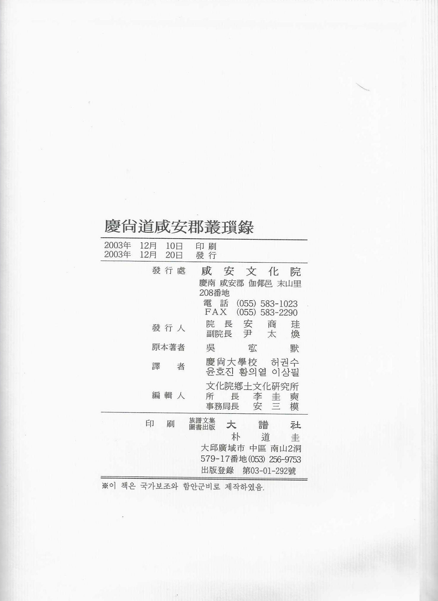 『慶尙道咸安郡叢瑣錄』은 1893년 오횡묵 군수(吳宖默 郡守)가 쓴 함안총쇄록(咸安叢瑣錄)을 번역하여 함안문화원에서 발간한 책으로 상·하(上·下) 두 권이다. 책은 권두에 안상규(安商珪) 함안문화원장의 발간사를 싣고, 함안군수의 축간사를 붙여 2003년 12월에 함안문화원을 발행처로 하고, 번역은 허권수, 윤호진, 황의열, 이상필이 했으며, 대보사가 인쇄했다. 책은 양장본으로 크기는 가로 194cm, 세로 264cm이며, 상권은 1205p, 하권은 1200p이다. 이 책은 2025년 8월 27일 함안문화원의 배려로 소장하게 됐다.