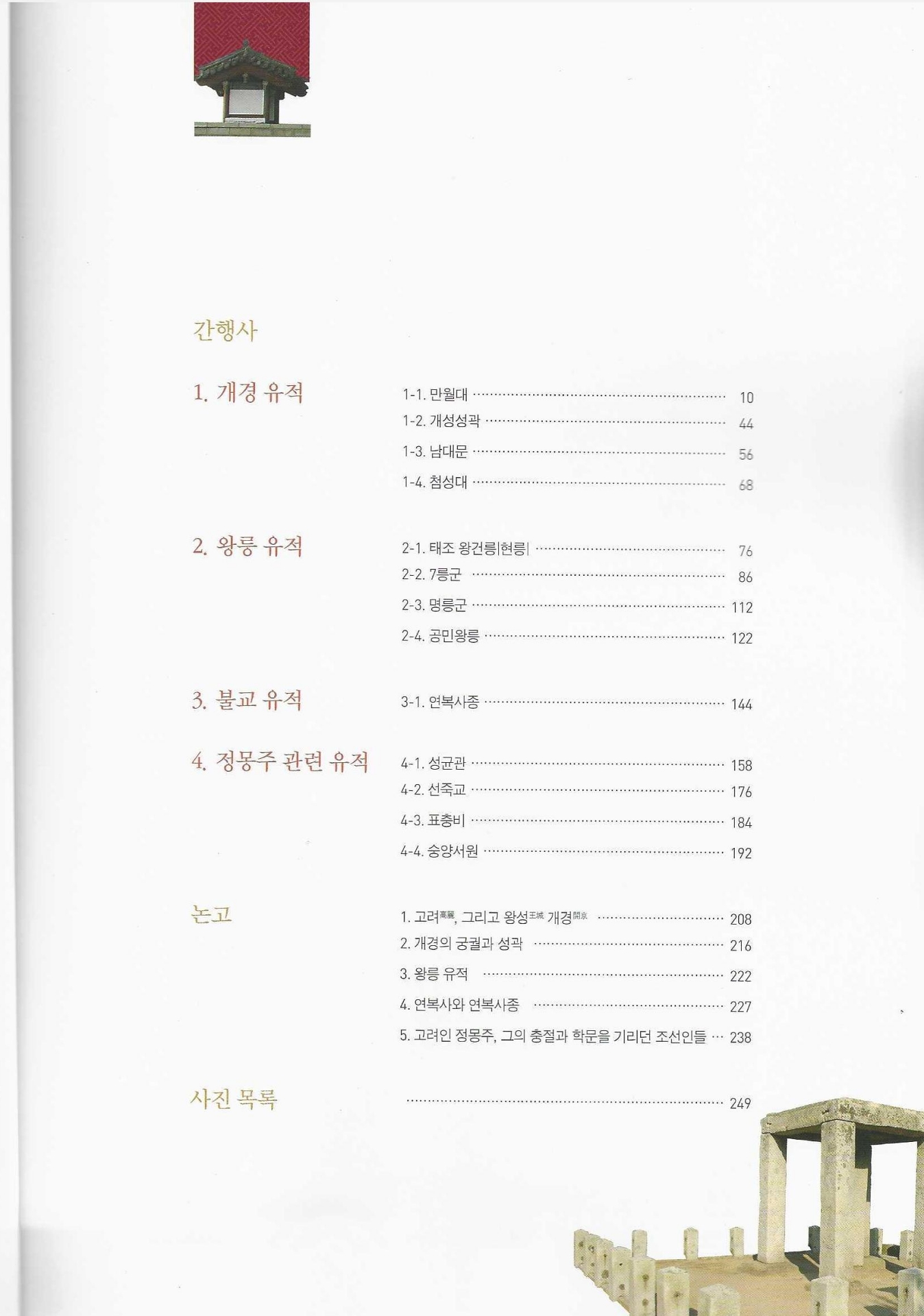 『개성의 역사와 유적』은 2018년 11월 27일에 국사편찬위원회 기획협력실에서 발행하고, ㈜신성토탈시스템에서 디자인·편집·인쇄한 책으로 고려건국 천백주년 기념으로 발간했다. 권두에 조광 위원장의 간행사를 붙였고 개경유적, 왕릉유적, 불교유적, 정몽주 관련 유적 등을 전체 컬러 사진으로 만든 책이다.