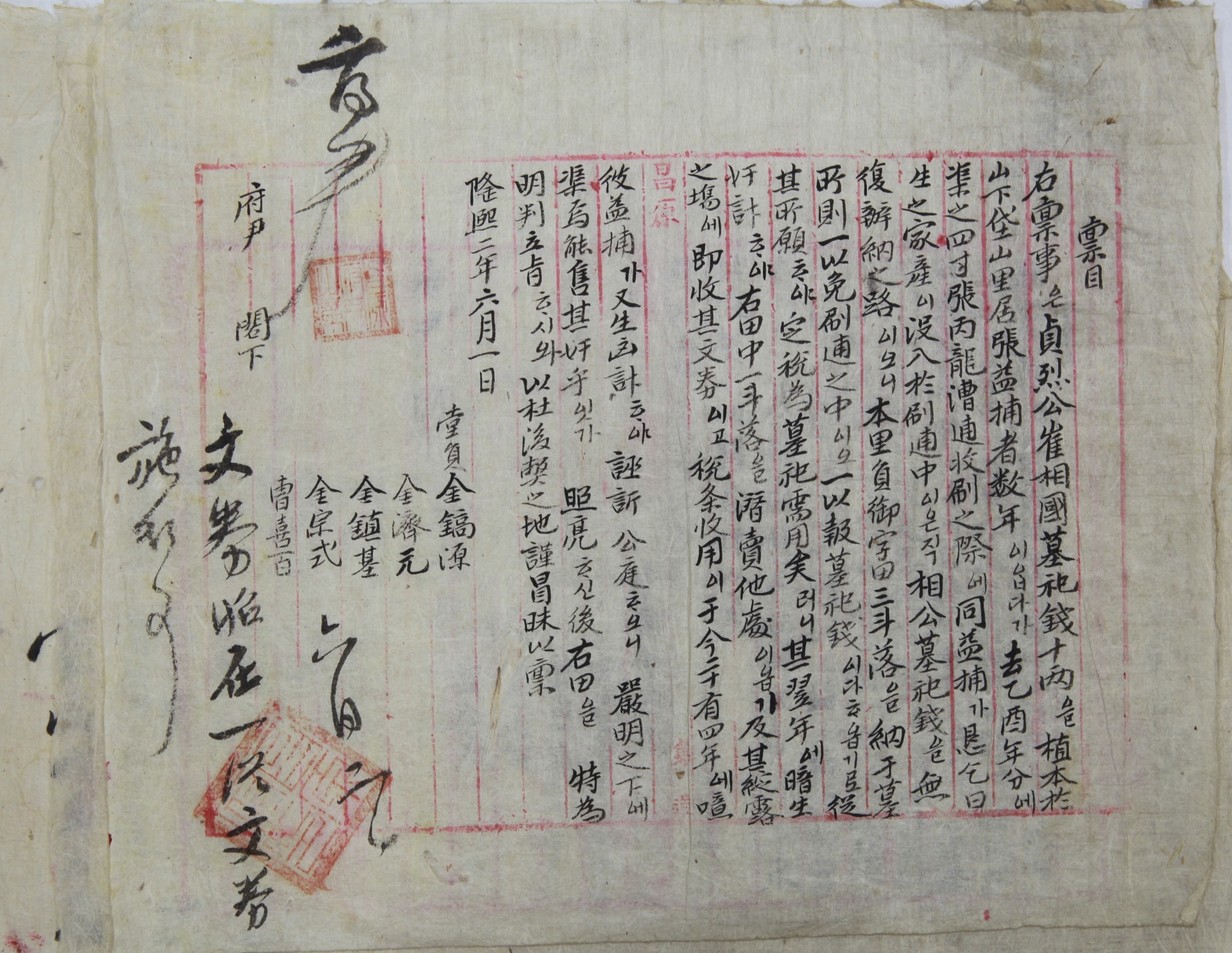 右稟事은 貞烈公崔相國 墓祀錢二兩을 植本於山下垈山里 居張益捕者數年이다가 去乙酉年分에 渠之四寸張丙龍漕逋收刷之際에 同益捕가 恳乞曰 生之家産이 沒入於刷逋中이온직 相公墓祀錢을 無復辦納之路이오니 本里負御字田三斗落을 納于墓所則一以免刷逋之中이오 一以報墓祀錢이다ᄒᆞ옵기로 從其所願ᄒᆞ야 定稅爲墓祀需用矣러니 其翌年에 暗生奸計ᄒᆞ야 右田中一斗落을 潛賣他處이옵기 及其綻露之塢에 即收其文券이고 稅條收用이 于今二十有四年에 噫