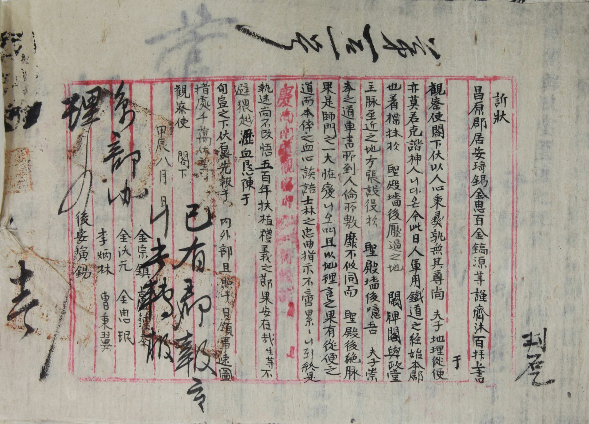 觀察使閣下 伏以人心秉彛孰無其尊尙 夫子地理從便赤莫君克諧柛人니다온 今此日人軍用鐵道之經始本郡也 着標抹於 聖殿墻後壓逼之地 闕牌閣與政堂主脉 至近之地 方張設役於聖殿墻後噫吾 夫子崇奉之道 車書所到人倫所敷靡不攸同 而聖殿後絶脉果是師門之一大恠變이오며 且以地理言之果 有從便之道 而本倅之血心談詰 士林之忠曲指示不啻累累니되 終是執迷尙不攺悟五百年扶植 禮義之節 果安在哉生等 不避猥越瀝血恳陳于 旬宣之下伏愿先報于 內外部且照于 日顧事速圖措處 千萬伏望
