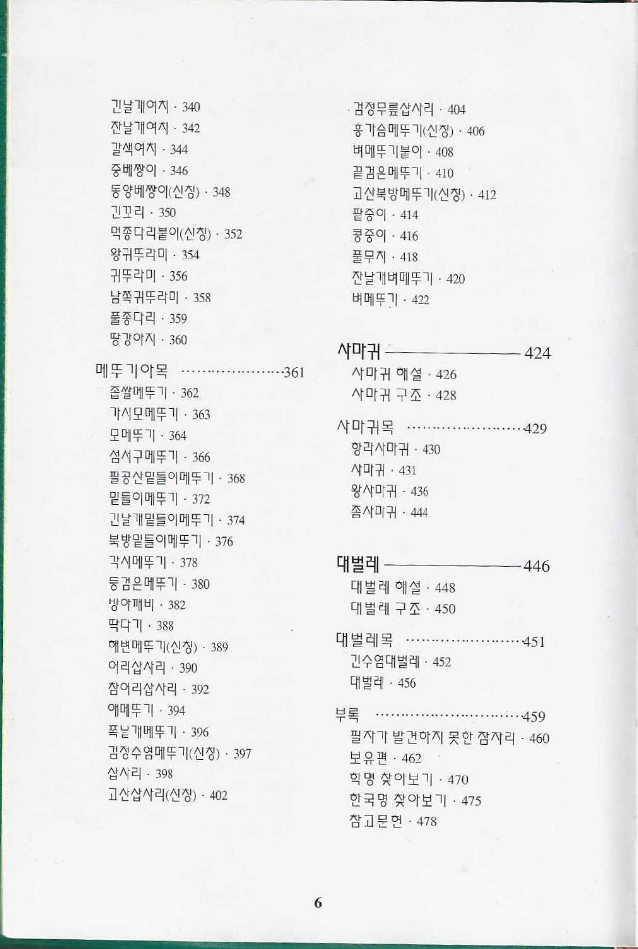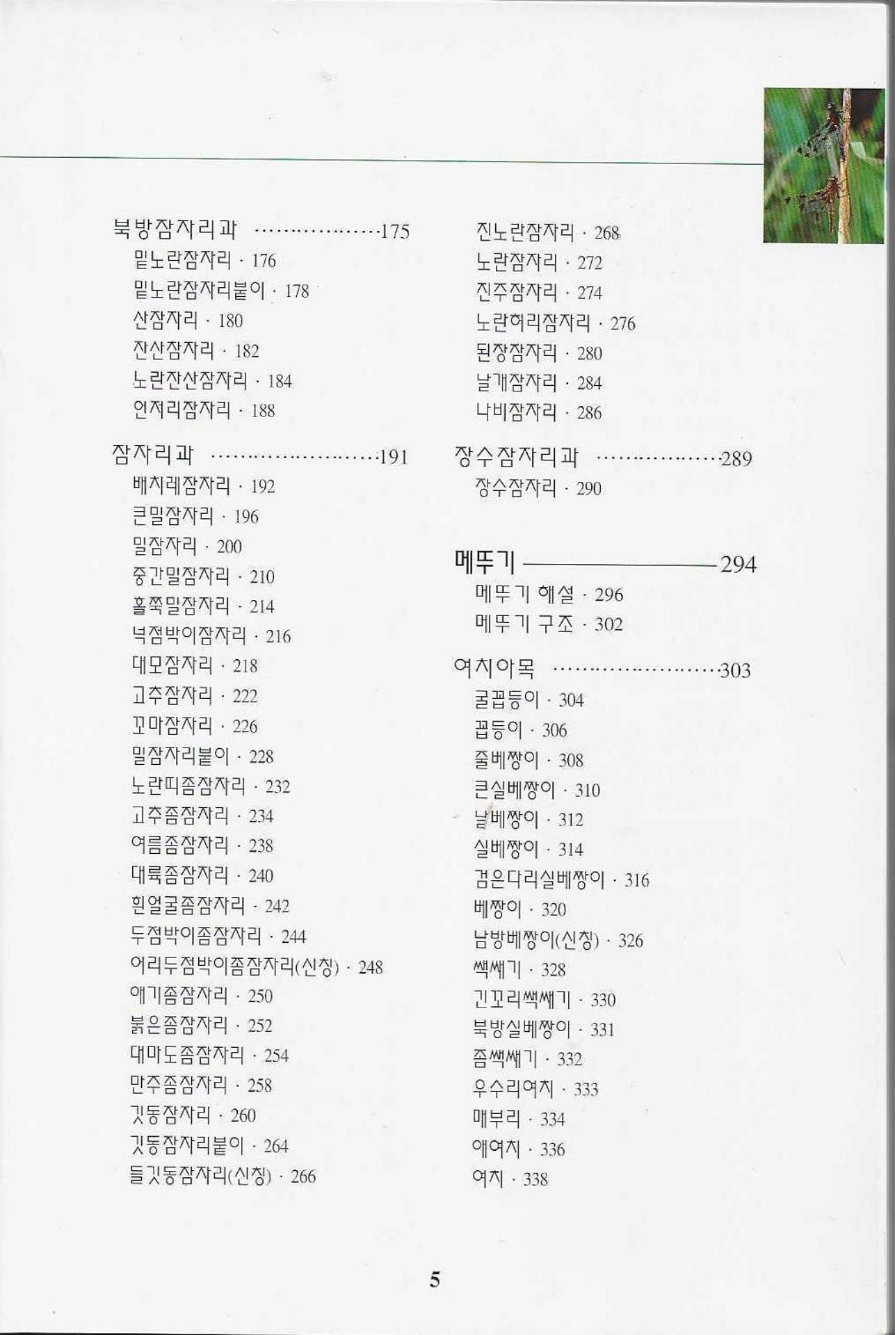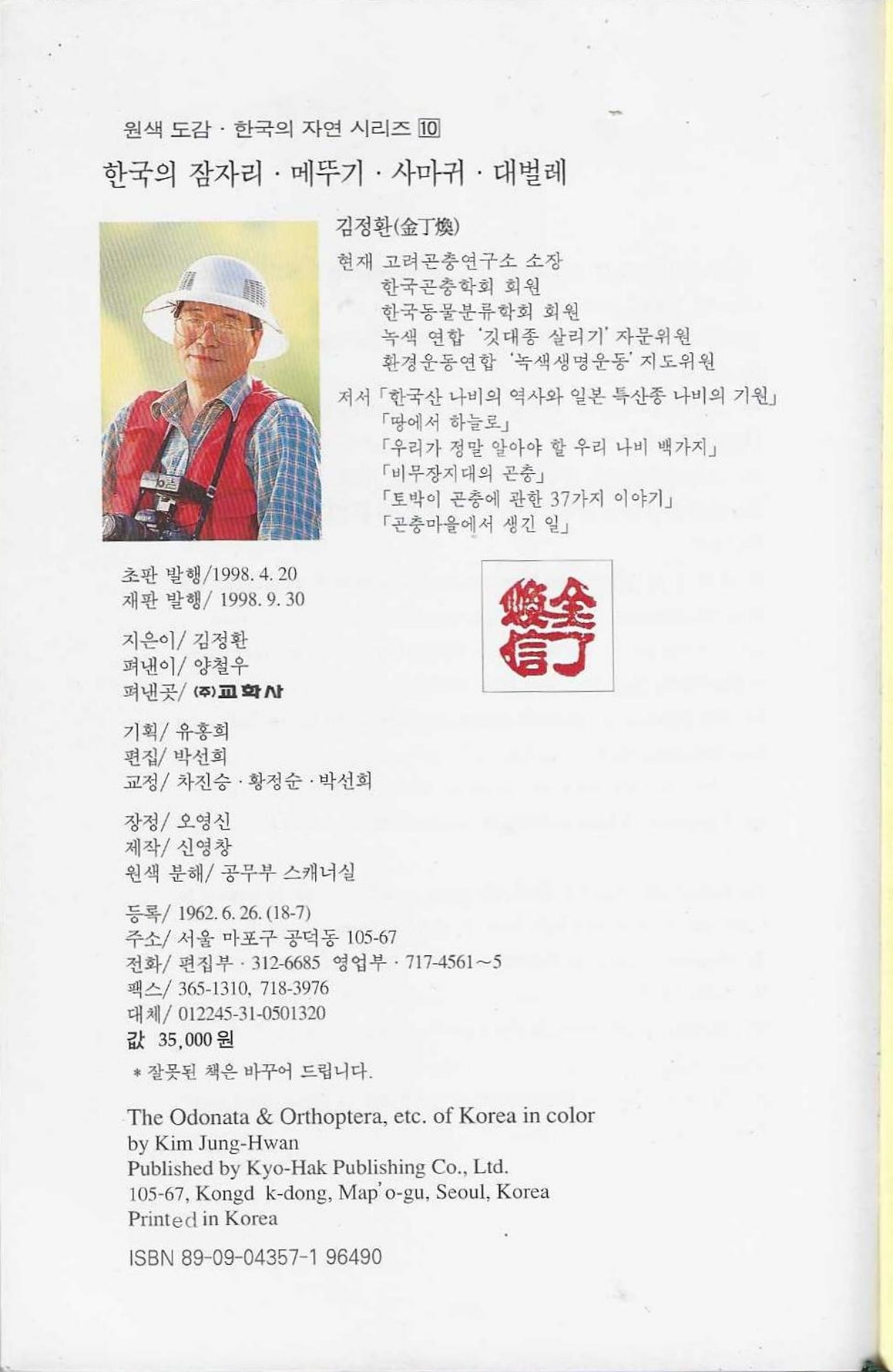 『[원색도감] 한국의 잠자리·메뚜기·사마귀·대벌레』는 김정환(金丁煥) 고려곤충연구소장이 짓고, 1998년 9월에 교학사에서 발행한 생태자료로 흔히 만나는 친숙한 곤충을 정리한 책이다. 제목처럼 잠자리·메뚜기·사마귀·대벌레의 이름을 알 수 있고 각 곤충의 생태를 파악할 수 있다.