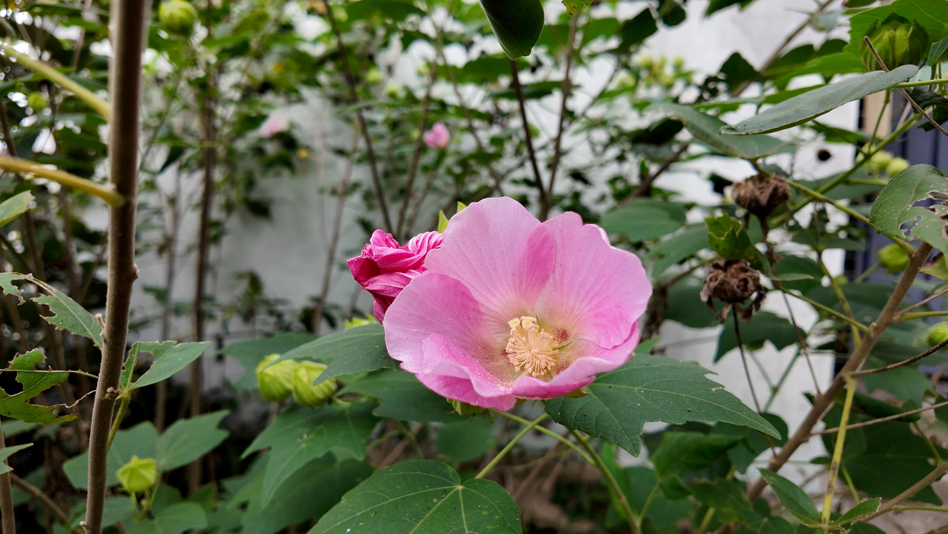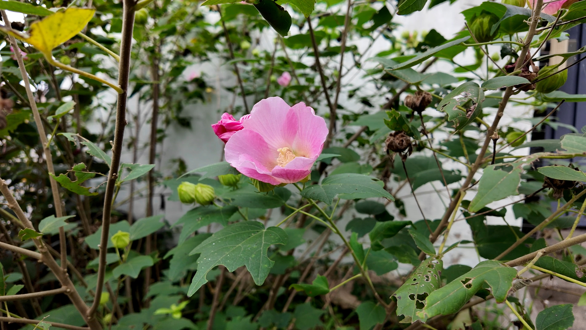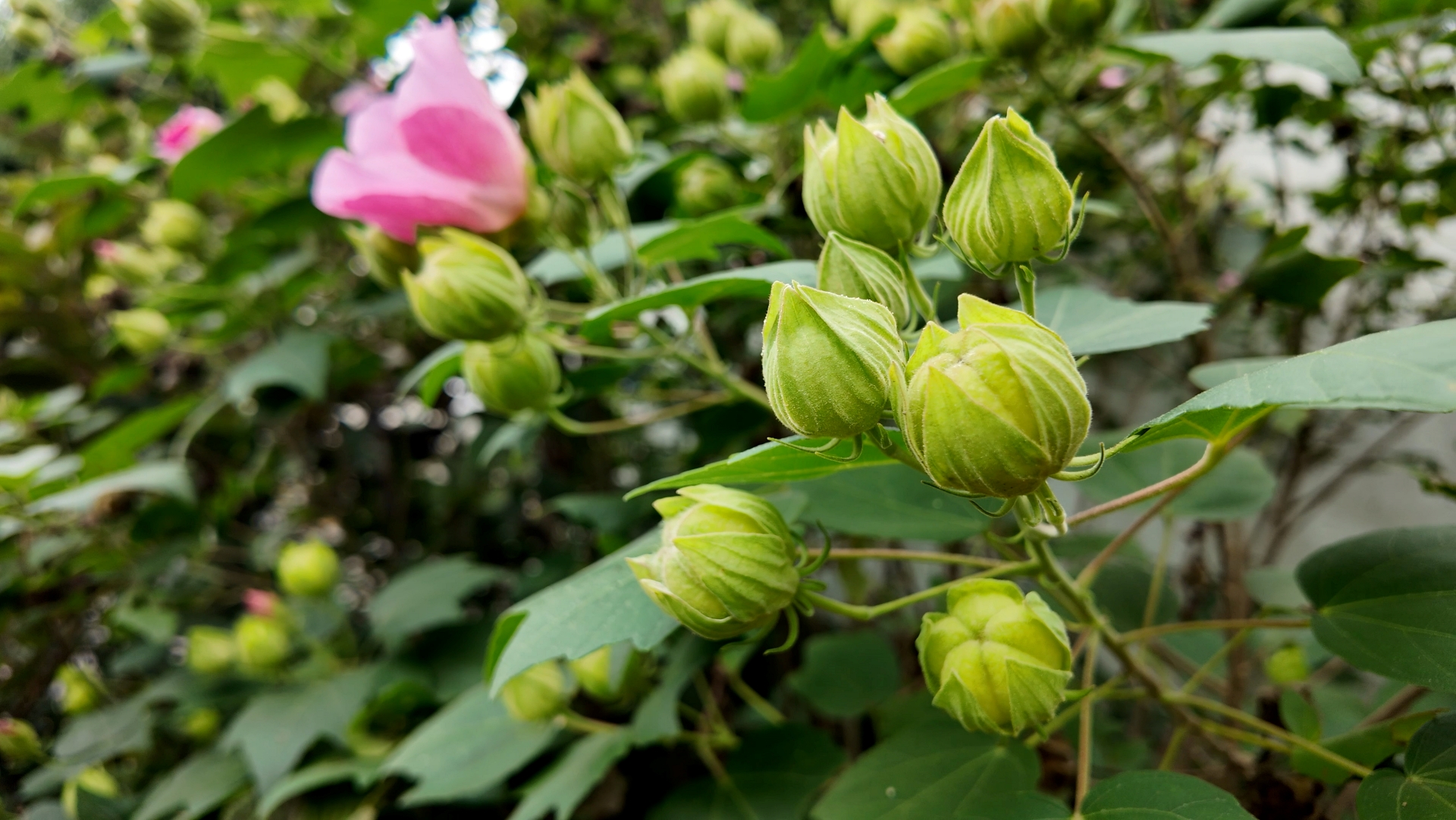 잎은 둥글고 3∼7개로 갈라지며 길이와 너비가 각각 10∼20㎝이다. 열편(裂片)은 삼각상 난형이며 꽃은 8∼10월에 연한 홍색으로 피며 지름 10∼13㎝이고 가지 윗부분의 잎짬[葉腋]에 1개씩 달린다. 꽃밭침통은 보통 중앙까지 5개로 갈라지며 소포(小苞)가 보다 길다. 과실은 삭과(蒴果)로 구형이며 지름 2.5㎝이다.