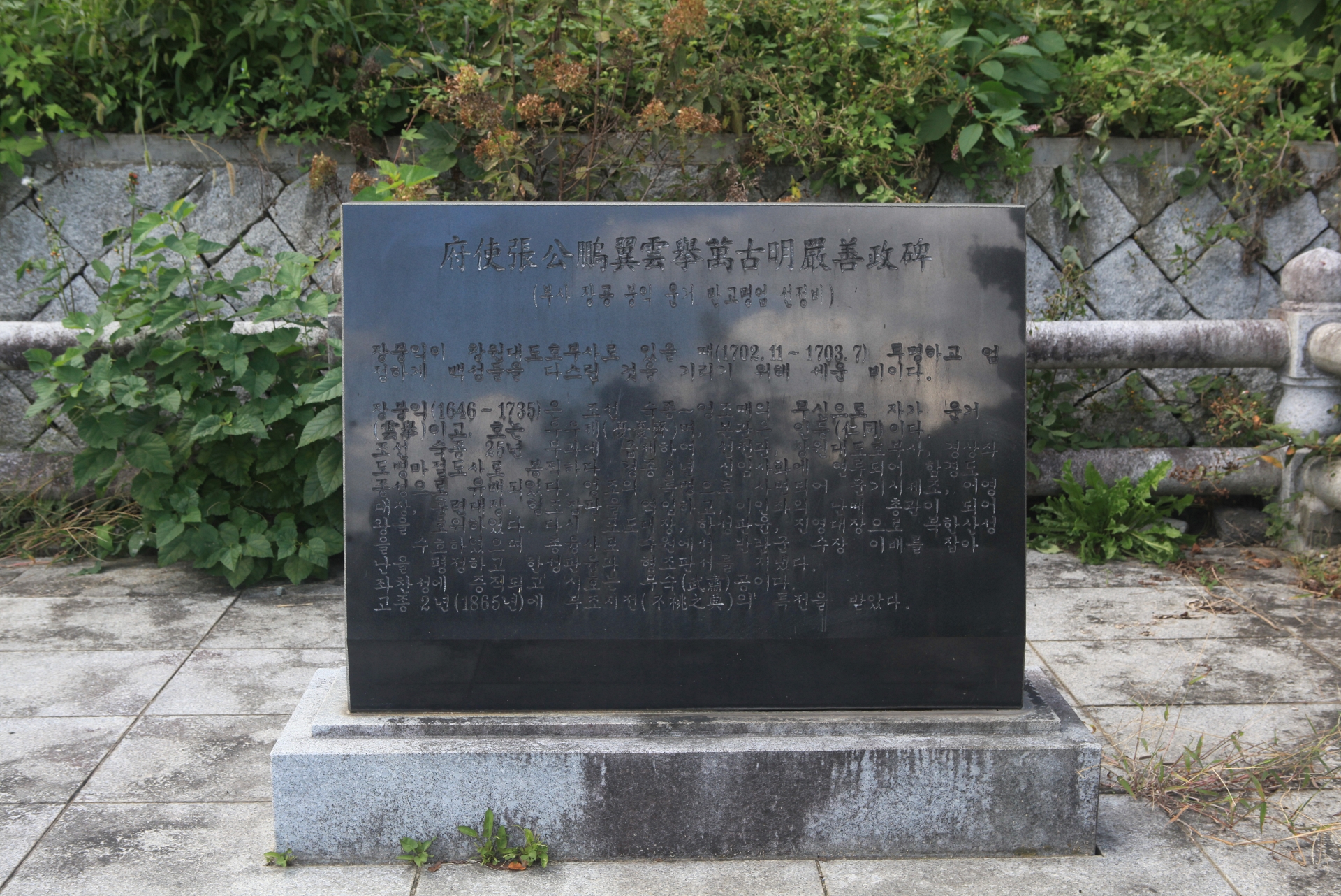 이 두 비의 안내 표식에는 『府使張公鵬翼雲擧萬古明嚴善政碑(부사장공붕익운거만고명엄선정비)』라 적고, 아래 내용을 기록했다.