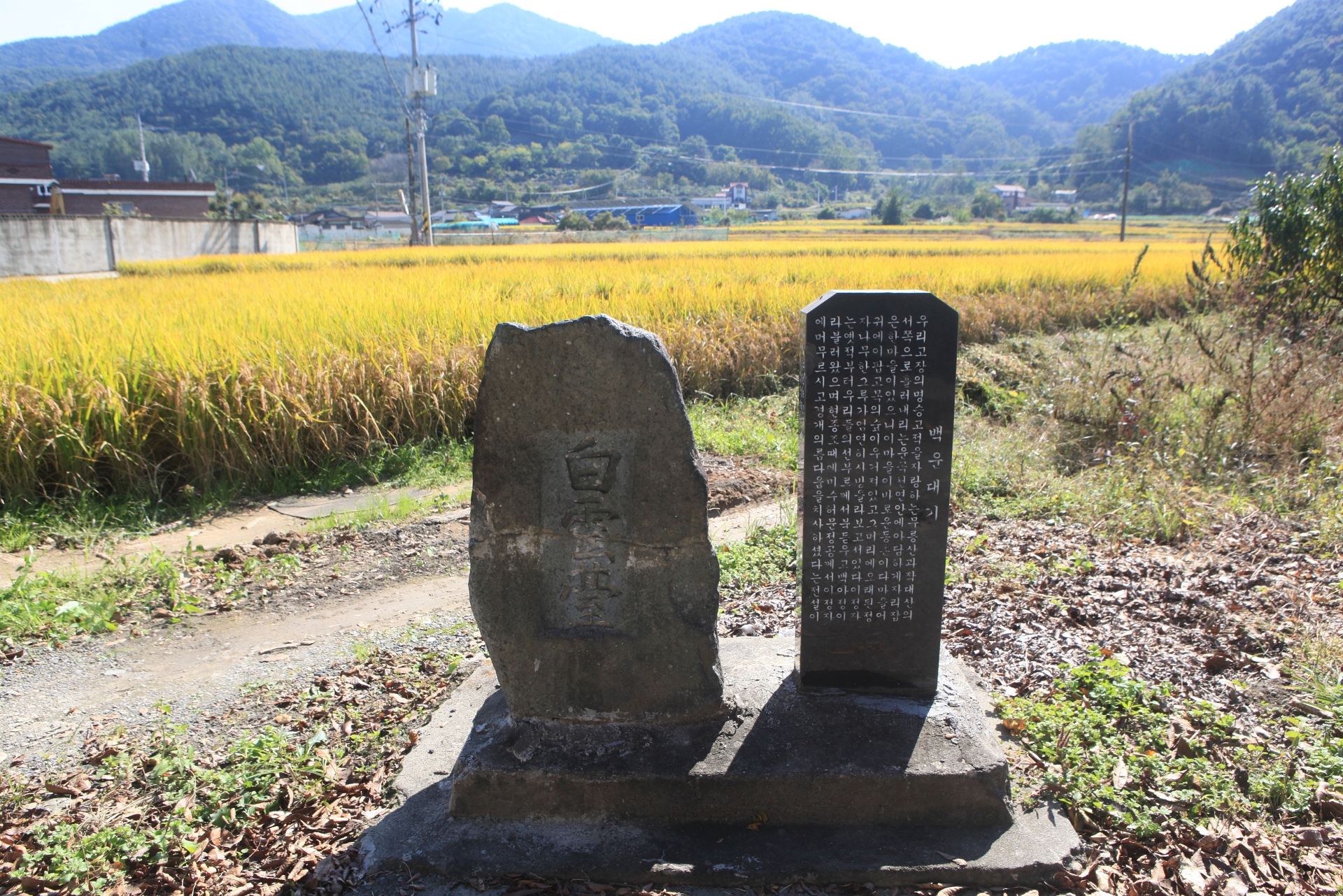 우리 고장의 명승고적을 자랑하는 무릉산과 작대산의 서쪽으로 흘러내리는 운곡천 연안에 아담하게 자리 잡은 한 마을이 있으니 이 마을이 바로 운동촌이다. 마을 어귀에 이팝 고목의 숲이 우거져 있고 그 머리에 오래된 정자나무 한 그루가 엄연히 사방을 바라보고 서 있다. 이 정자는 옛적부터 우리들의 선부로께서 북돋우고 백아정이라 불러 왔으며 현종조 때에 미수 허문정공께서 이 정자에 머무르시고 경개의 아름다움을 치사하셨다는 전설이 전해왔다. 그러므로 역대 인사들은 이러한 천연기념수의 전설을 되살리고저 노력하여 왔으며 그중에 특지자 한 사람이 있으니 이는 곧 향토애가 가장 열열한 昭岡 金小景(소강 김소경)씨 였다. 공은 경술년에 백아정을 수리하고 정명을 백운대로 고쳤으며 유지인 백운계를 조직하여 영세불민을 도모하여 왔다. 공의 그 위대한 공적과 불타는 향토애는 우리 지방 사람들의 모범이 아닐 수 없다. 또 우리들이 환영하고 찬양할 바는 갑인년 봄에 고 小景(소경)씨의 윤우 基一基大基明(기일기대기명) 손 대현현석규완군이 자기 선대인의 뜻과 업적을 후세에 들내고저 본대를 중수하고 계금을 보충하여 주니 그 2대 공적은 맑아오는 백운대와 함께 천추에 기리 빛 나도다.
