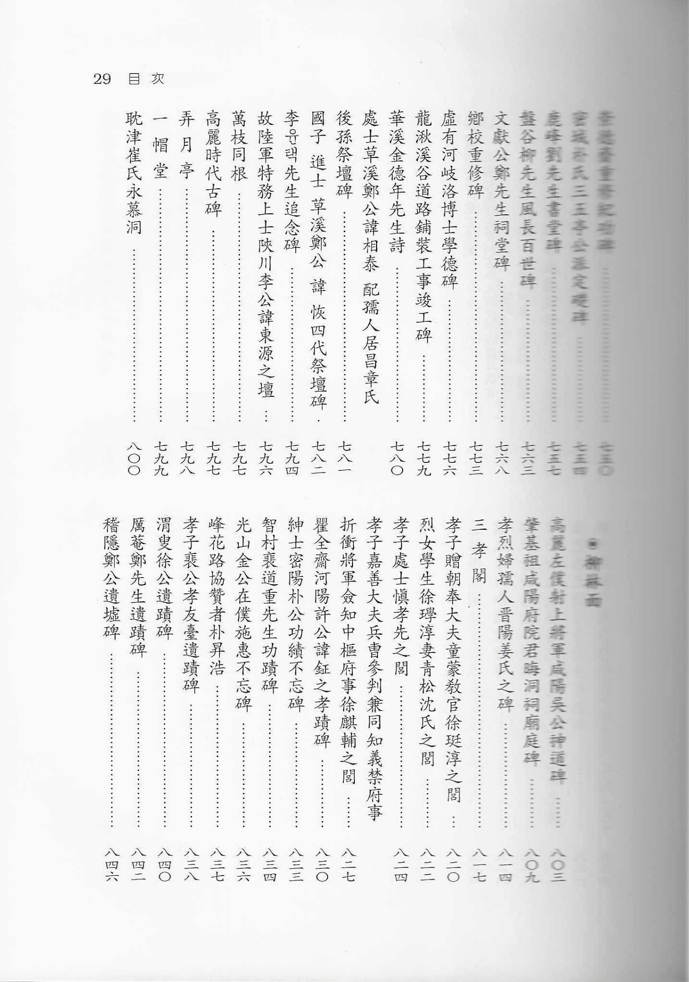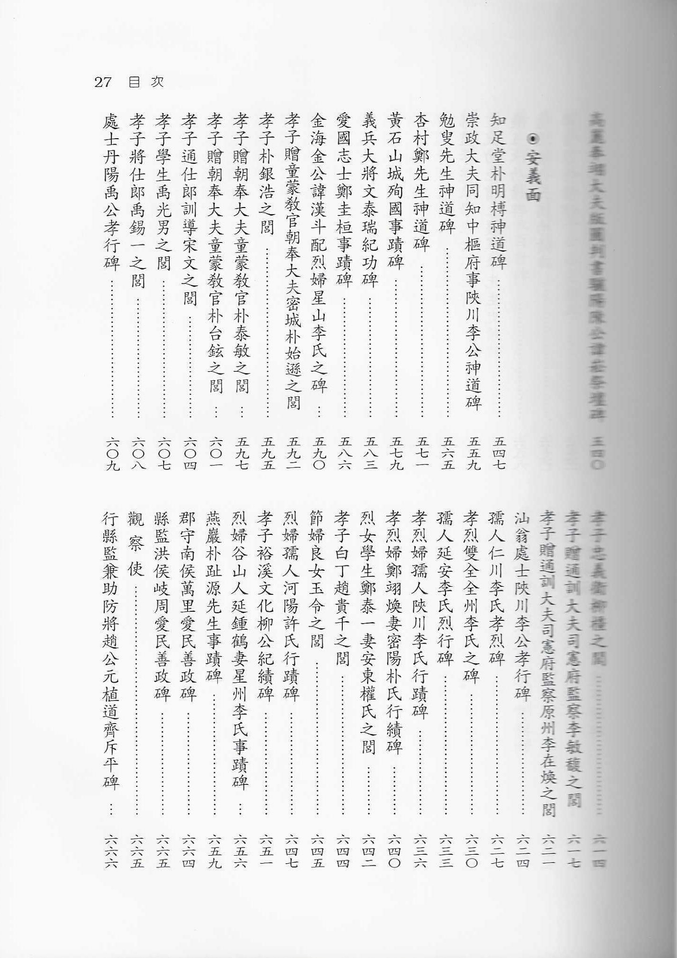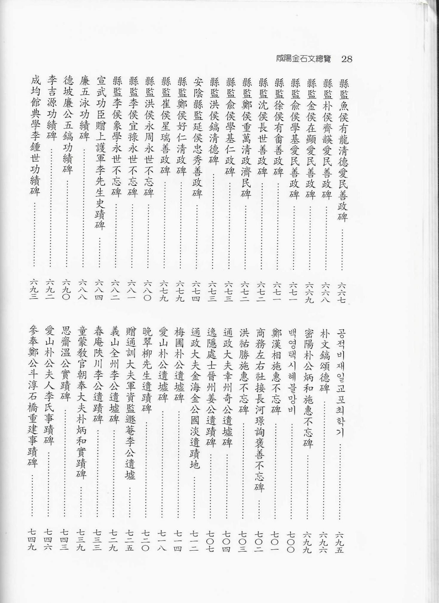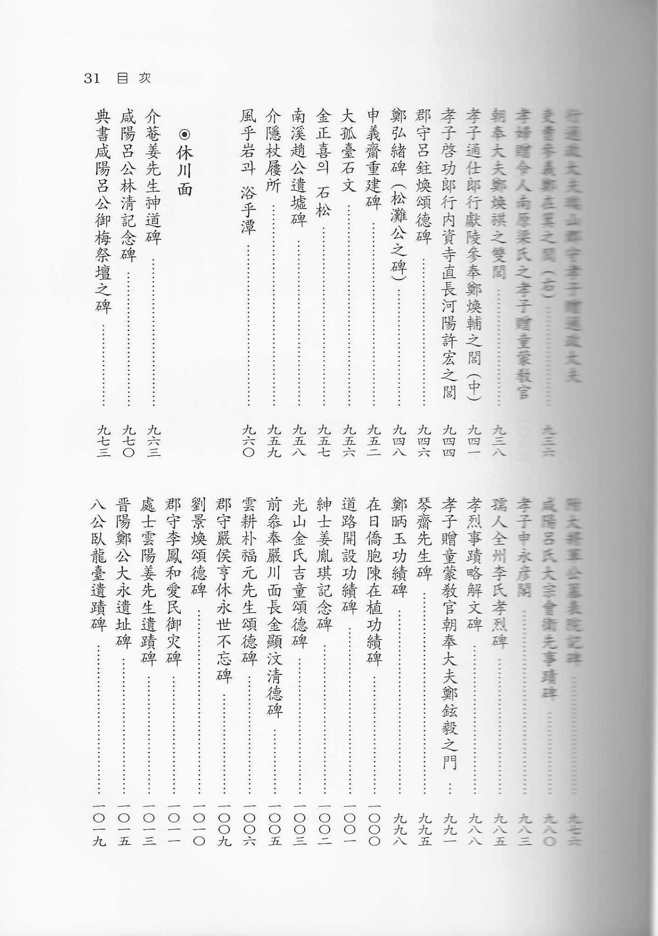 목차는 크게 함양읍·마천면·백전면·병곡면·서상면·서하면·수동면·안의면·유림면·지곡면·휴천면의 금석문을 실었다.