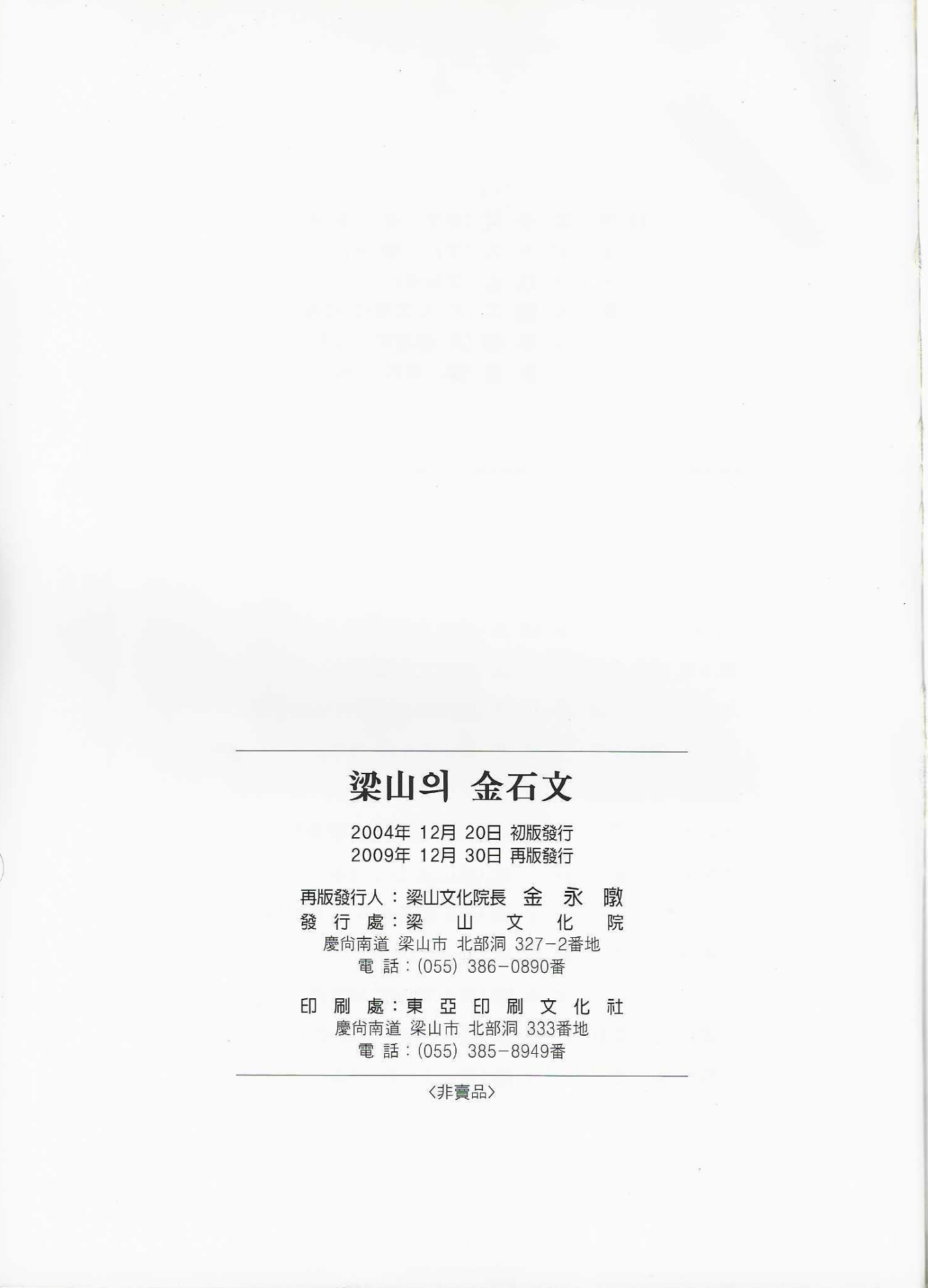 『梁山의 金石文』은 양산문화원에서 2004년 초판을 발행하고, 2009년 12월 30일에 재판을 발행했다. 동아인쇄문화사에서 인쇄해 발간한 책이다.