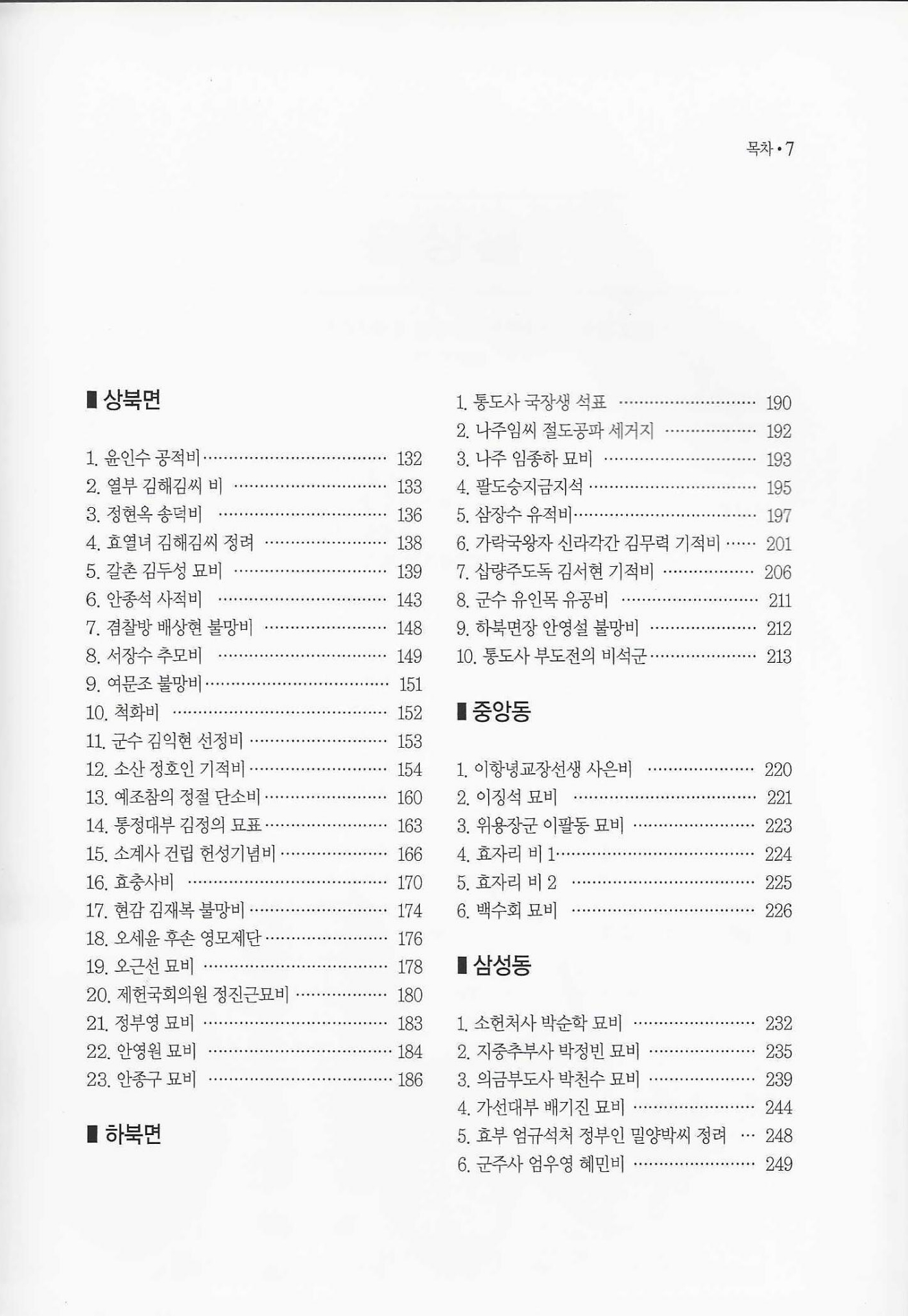 권두에 김영돈 문화원장이 쓴 「양산의 금석문(金石文)」 재판경위를 붙이고, 2004년 초판 발행 때의 이종관(李鍾寬) 문화원장의 발간사가 이어져 있다. 일러두기를 붙인 후 목차를 실었는데 웅상읍·물금읍·동면·원동면·상북면·하북면·중앙동·삼성동·강서동-춘추원·강서동-향교의 순으로 엮었다.