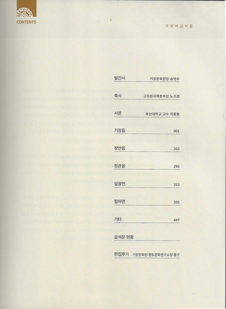 목차는 기장읍, 장안읍, 정관읍, 일광면, 철마면, 기타 등으로 실었으며, 편집후기를 황구 기장문화원 향토문화연구소장이 썼다.