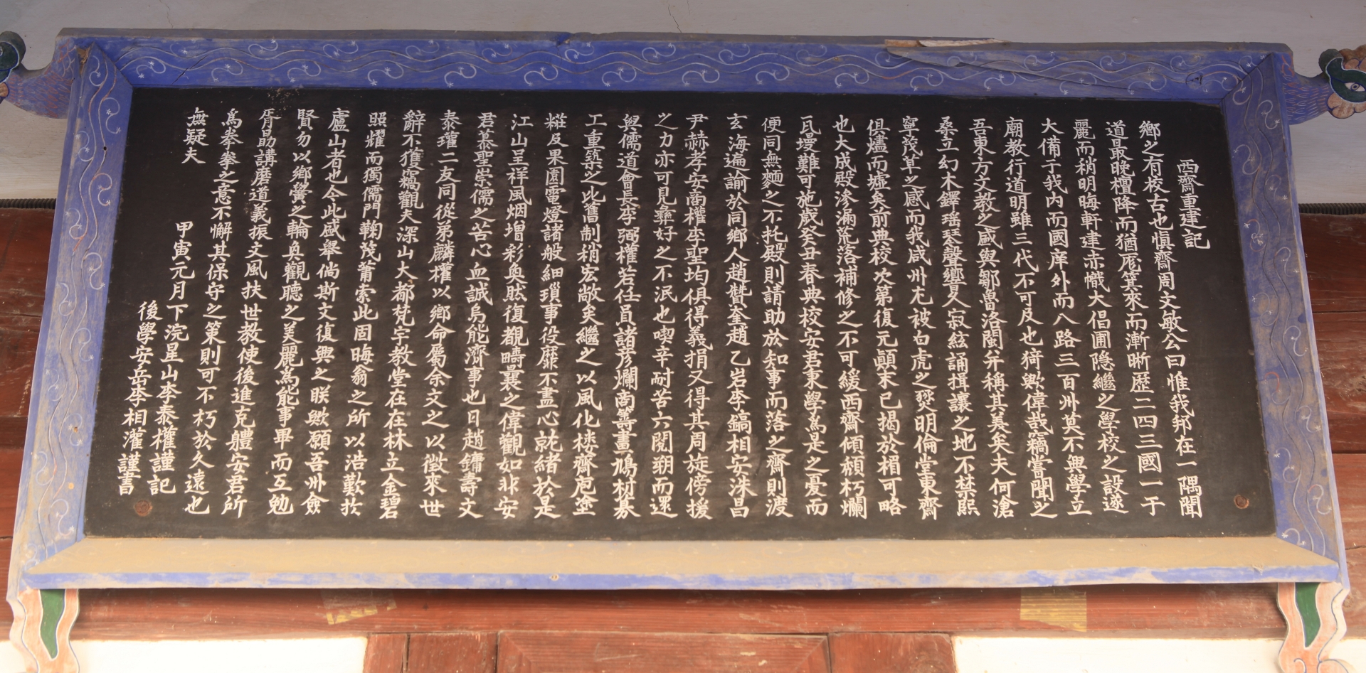 去庚寅動亂入城化為灰燼蒼生魚肉矣 吾鄉大成殿則幸爲免禍 而東西廡諸賢牌位散逸無遺明倫堂及東濟皆 爲燒失亂稍定諸賢位牌權奉于 大成殿左右矣 及至趙學來氏之典校重建明倫堂規模頗勝 於前可欽其尊賢衛道之誠矣 安運中氏繼任建庫舍沿垣墻其心亦動且勞矣 運中氏之辭任鄉父老薦不佞 以典之卽甲辰八月釋奠祭日也 顧不侫之誠與不及於前日二君子惟恐瀆任 而招父老之誅誚也 夙夜恐懼庶竭吾鈍與掌議諸員周視大成殿 則前頹後懷而東齋舊虛 則只增茂草之歎矣 校之所有財前此已爲成均館所收去幾 盡復舊之役計無所出 於是會掌儀議之曰 役之次第則當先殿 而後齋其所需之費 則請捐於吾鄉人士之在京有力者 如何僉曰 諸議旣定因與掌議幾 員走京遍訪則同聲隨應者數十人 而趙洪濟成樂三兩氏 最其尤者也 遂招工補修大成殿至於苟完 而始終賢勞者李仁燮趙光濟也 丙午秋享後不侫以任滿辭咸曰 大成殿之重修吾子殫勞矣 而東齋尚未復請吾子無辭以完餘力也 不侫難違父老之言更選任員與儒道會長李鎬燮 及掌議諸員議東齋復舊之事 而創尊聖契每面掌儀二員分會長一員各持契案訪鄉各門 以尊聖之竟勸入于 案則費可醵而齋可復也 因爲推進果如所料 而郡守朴京濟聞于 道以十萬金助之費猶不足際有姓朴名水正者 以吾鄉人僑居日本 而特捐萬金其秉彛之衷可尙 今年春功始告成五楹四架東西 爲房室南爲廳事以其餘金 又及於大成殿風化樓丹靑垣墻之盖瓦幹之任殫勞者 分會長趙性智掌儀金貴斗李弼權李仁燮也 是年七月日牌櫝又成矣 通告于鄉內儒林奉安 東西廡十八賢盖延二十年之久 而今始完役茲安定位於是焉 山益高水盆清 而先聖先賢之靈 若陟降而左右之也 遂畧記事實如右云爾