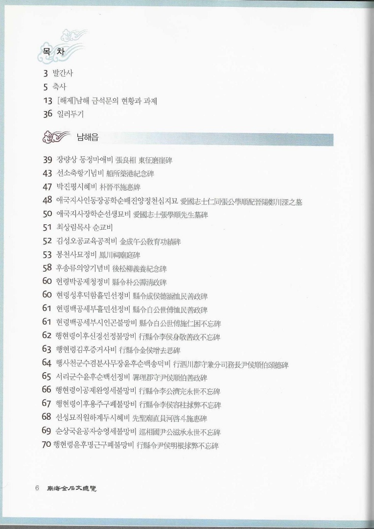 권두에 남해문화원장 하미자의 발간사를 담고 향토사연구소장 김동규의 축사를 실은 후 목차를 붙였다. 목차는 크게 읍·면단위로 구분하였고 남해읍, 이동면, 상주면, 삼동면, 미조면, 남면, 서면, 고현면, 설천면, 창선면 등으로 분류하였다.