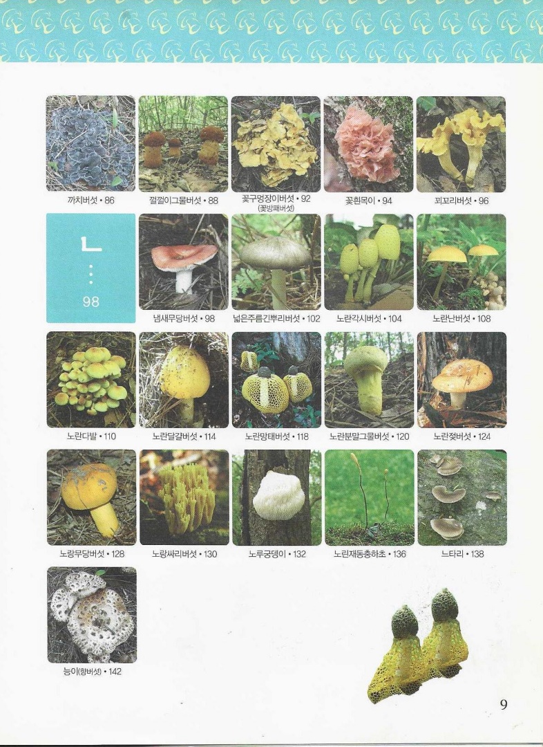 냄새무당버섯 / 넓은주름긴뿌리버섯 / 노란각시버섯 / 노란난버섯 / 노란다발 / 노란달걀버섯 / 노란망태버섯 / 노란분말그물버섯 / 노란젖버섯 / 노랑무당버섯 / 노랑싸리버섯 / 노루궁뎅이 / 노린재동충하초 / 느타리 / 능이(향버섯)