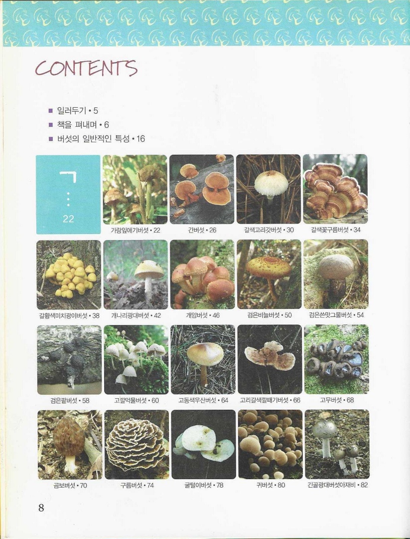 권두에 ‘일러두기’와 저자 일동의 ‘책을 펴내며’ 붙인 후 차례를 ㄱ·ㄴ·ㄷ~ㅌ·ㅍ·ㅎ 순으로 사진을 싣고 버섯 이름을 기록했다. 권말에 부록으로 ‘버섯구조에 관한 용어’을 실어 초보자도 버섯 형태를 구분할 수 있도록 했다.