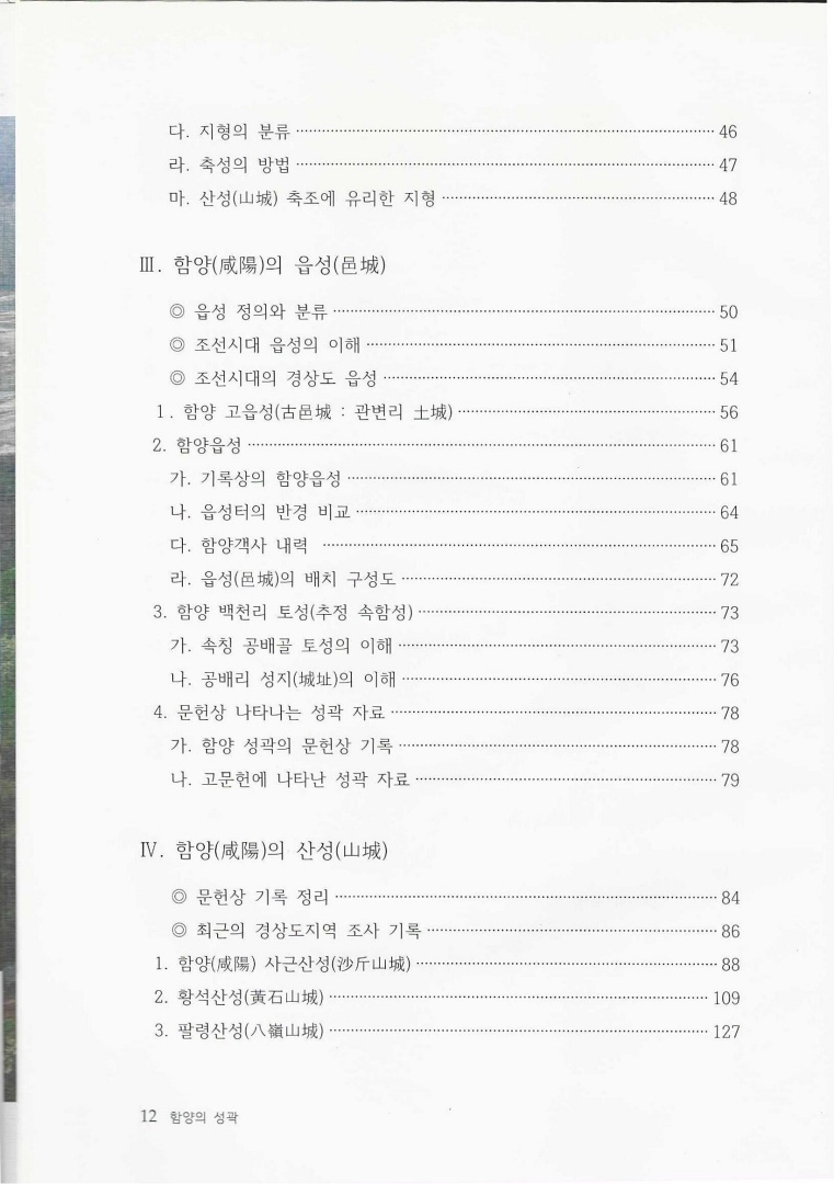 권두에 함양문화원장 김흥식의 발간사를 붙이고, 서춘수 함양군수와 황태진 의장의 축간사를 실었으며, 향토사연구 소장 정상기의 “『함양의 성곽』 발간에 즈음하여”를 붙인 후 다음 목차를 실었다. 또한 영남읍지(1895)와 경상도읍지(1832)에 실린 그림을 넣어 역사적 근거를 확보했고 함양읍, 마천면, 휴천면, 유림면, 수동면, 지곡면, 안의면, 서하면, 서상면, 백전면, 병곡면, 등 11개 읍면의 간략한 역사와 문화를 수록했다. 또한 성곽에 대한 해제를 실어 성곽의 이해에 쉽게 접근할 수 있도록 설명하였다.