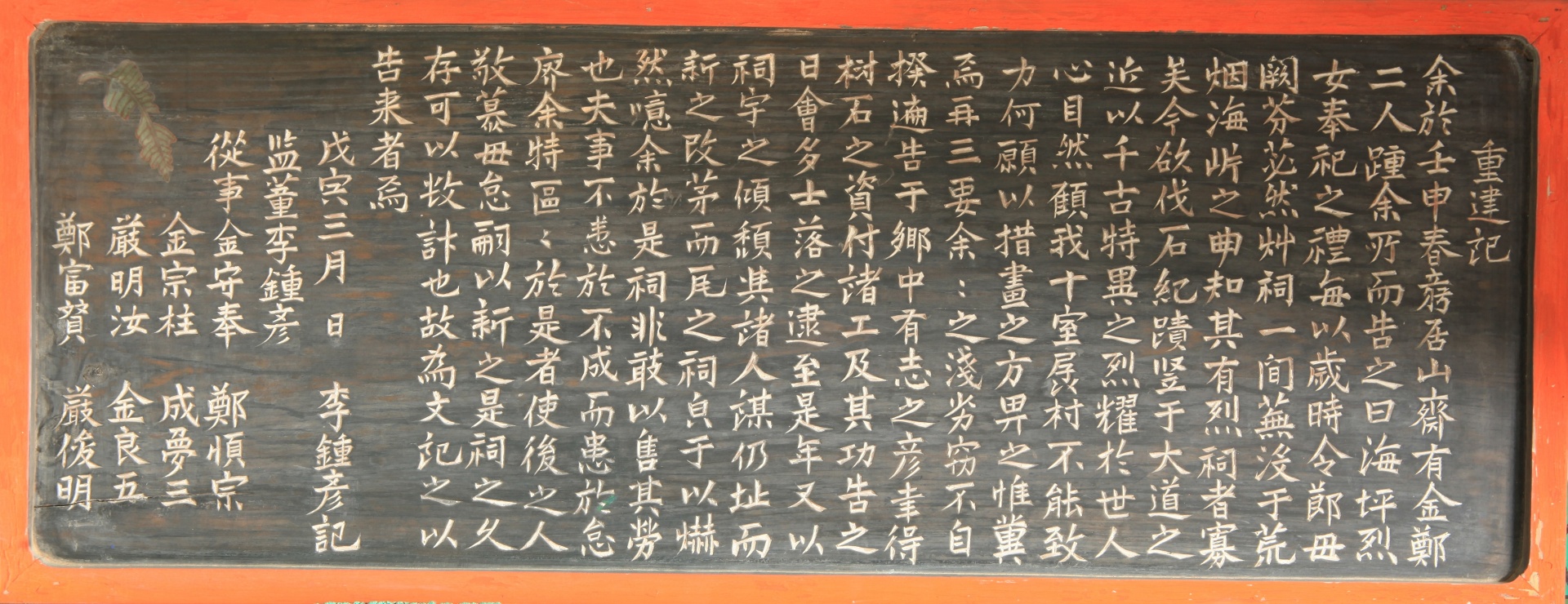 余於壬申春豙居山齋 有金鄭二人踵余所 而告之曰 海坪烈女 奉祀之禮 每以歲時 今蓈毌闕芬苾 然艸祠一間蕪沒于 荒烟海㟁之曲知 其有烈祠者寡矣 令欲伐石紀蹟竪于 大道之近 以千古特異之烈耀 於世人心目 然顧我十室孱村不能致力何願 以措畵之方畀之惟黨焉 再三要余余之淺劣窃不自揆遍告于 鄕中有志之彦幸得樹石之資付諸工及其功告之日會多士落之逮至是年 又以祠宇之傾頹集諸人謀仍址而新之攺茅 而瓦之祠皃于 以爀然憶余於 是祠非敢以售其勞也 夫事不患於不成而患於怠庎 余特區區於是者使後之人敬慕毋怠嗣 以新之是祠之久存可 以數計也 故爲文記之以告來者焉