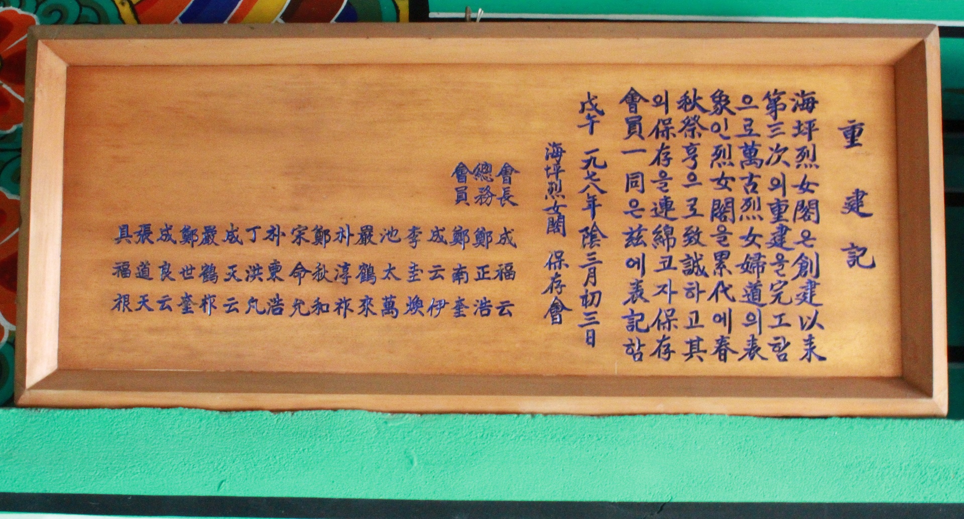 海坪烈女閣은 創建以來 第三次의 重建을 完工함으로 萬古烈女婦道의 表象인 烈女閣을 累代에 春秋祭享으로 致誠하고 其의 保存을 連綿코자 保存會員一同은 玆에 表記함