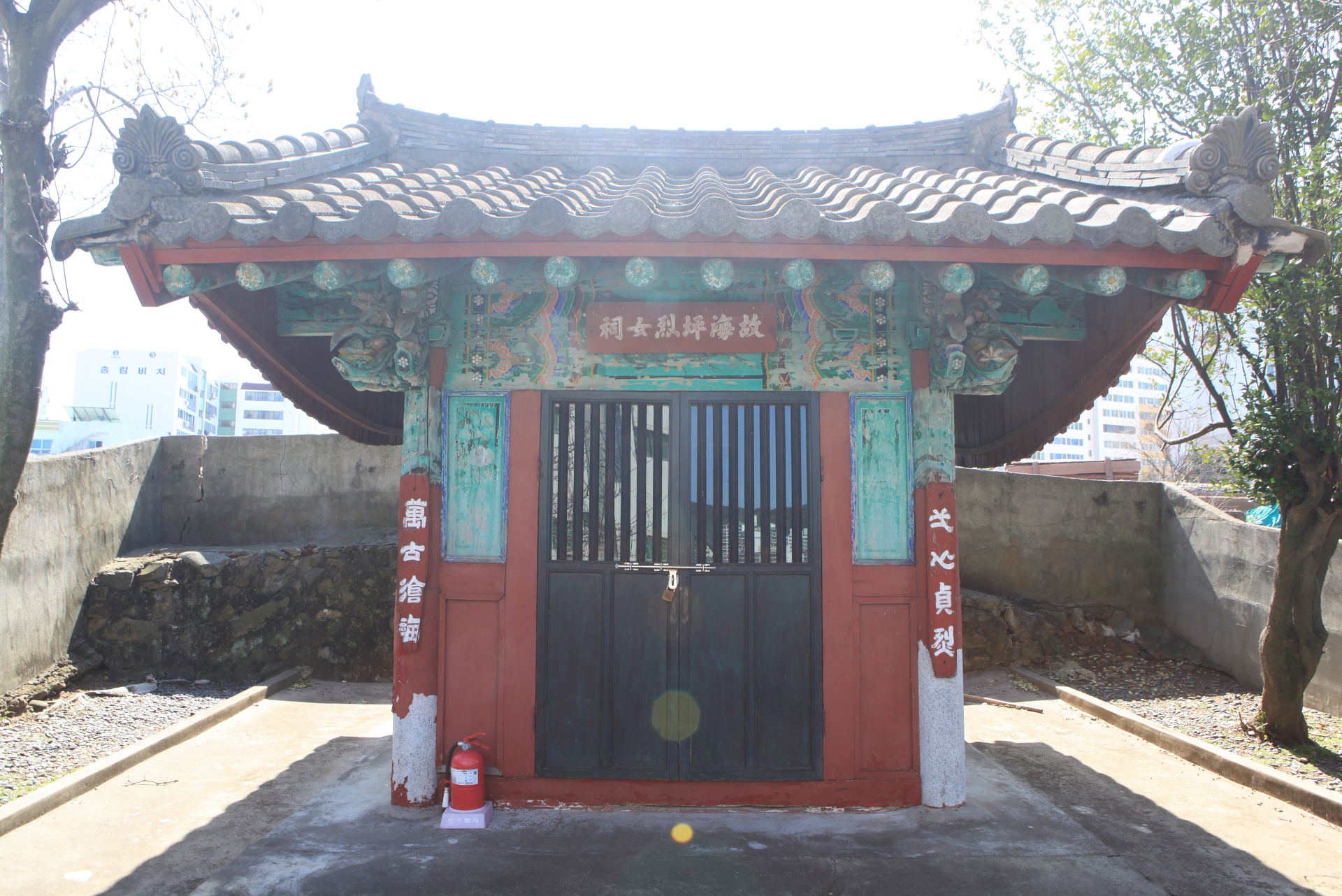 1887년(고종 24) 이러한 해평열녀 이야기를 전해 들은 허진(許珍. 許瑾이라는 설도 있다)이라는 분이 이곳 바닷가에 그녀의 넋을 위로하는 작은 초가사당을 최초로 지었다고 한다. 마을 사람들은 4절기마다 상식(上食)을 올리고 제사를 지내기 시작했다. 1927년 정월에 사당(祠堂) 주변을 토담으로 쌓았으며, 1932년 사당 앞에 버드나무를 심고 봉숫골(烽燧谷)로 오르는 봉평동 비석고갯길에 ‘고해평열녀기실비(古海坪烈女紀實碑)’를 세워 열녀의 혼을 추모하고 귀감이 되도록 했다. 1938년 봄 기와로 중건했으며 1988년 다시 사당을 중수하여 오늘에 이르고 있다.