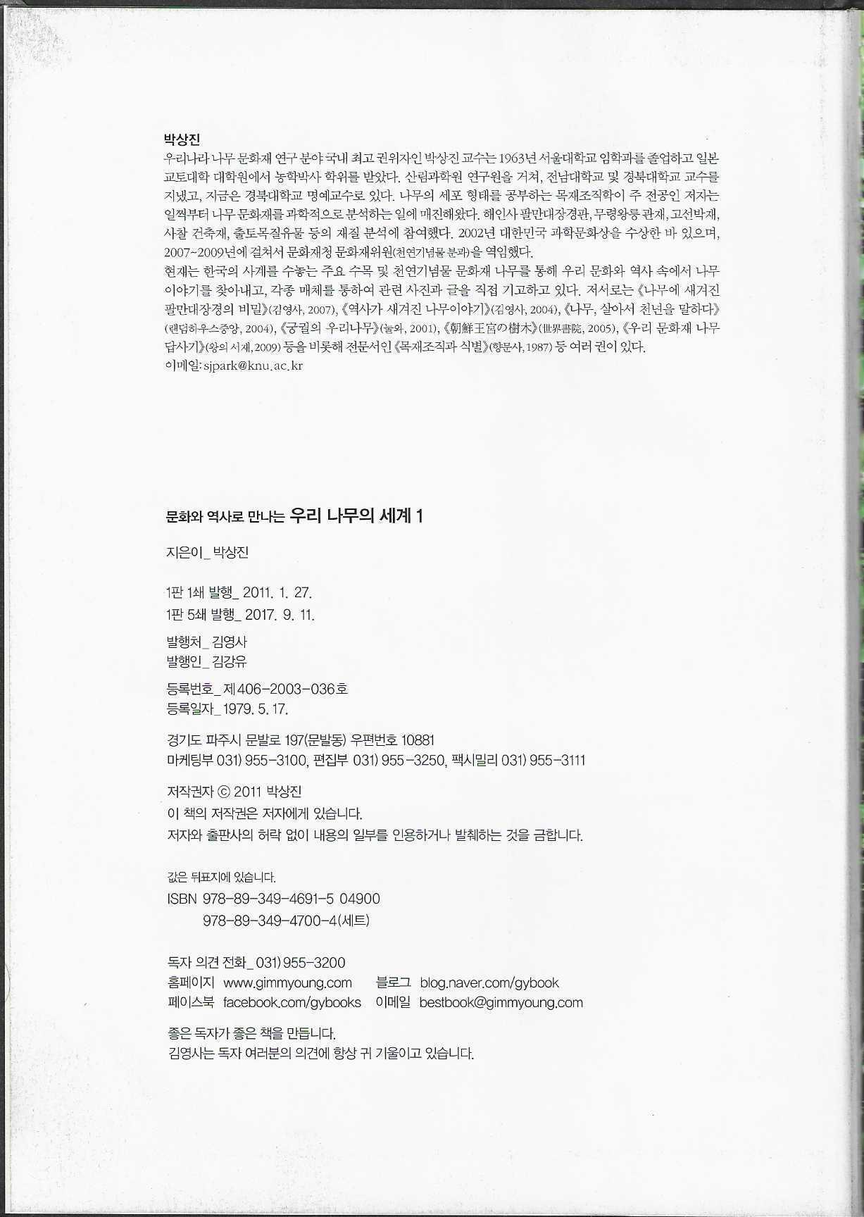 문화와 역사로 만나는『우리 나무의 세계1』는 2011년 1월에 초판이 발행되고 2017년 9월에 1판 5쇄가 발행된 책으로 지은이는 박상진이고, 발행처는 김영사이다.