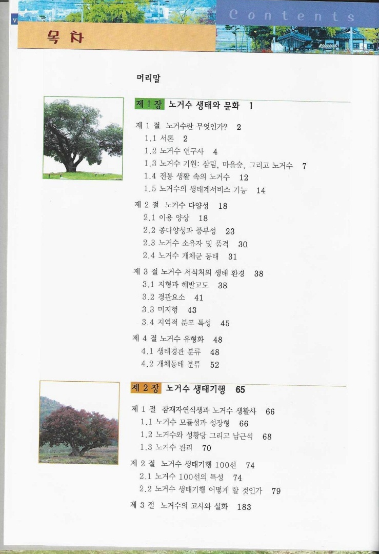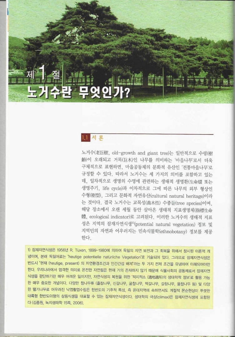 전통 마을 공동체 문화의 독특한 산물인 노거수에 대한 생태학적 접근의 분석서. 1999년부터 2005년까지 경상북도 전역의 노거수에 대한 현지 식생조사를 실시해서 나온 결과물들을 남아놓은 기록물이다. 우리나라 전통마을나무에 관해 세세히 적어내고 있다.