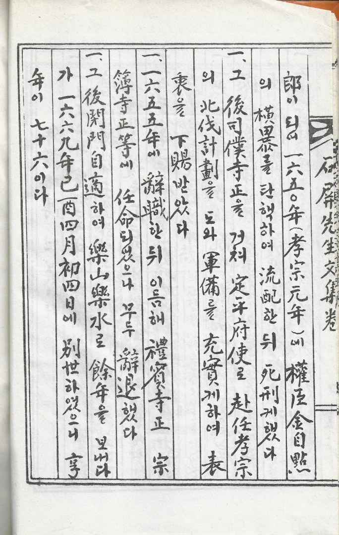또한, 1649년(인조 27)에 왕의 학문으로 『춘추(春秋)』를 강조하고, 시폐(時弊)를 혁파하고 의리를 분명히 할 것을 주장하면서 김자점(金自點)의 죄를 성토한 「기축봉사(己丑封事)」 및 그것의 재소(再疏)·삼소(三疏)가 있다.