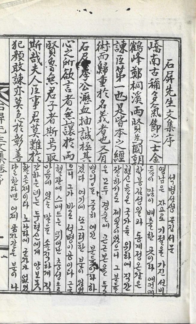 『국역 석병집(國譯 石屛集)』은 1908년에 간행한 『석병집(石屛集)』을 필사하고 아래에 한글 번역문을 직접 쓴 글씨로 기록해 두었다. 구성은 『석병집(石屛集)』과 마찬가지로 당성(唐城) 홍직필(洪直弼)이 쓴 서문을 권두에 붙이고 연보약전(年譜略傳)을 넣은 후 목차를 실었다. 권말에 후손 강호(康鎬)의 발문까지 번역했고, 임술년(壬戌年;1982) 국역해 다시 발간 하면서 11대 후손 태석(台錫)의 발문을 국한문 혼용체로 기록해 두었다. 책은 오침안정법(五針眼訂法)으로 엮었고, 노루지 겹장에 순 한문으로 기록되었고, 건·곤(乾·坤) 2책으로 엮었다. 책은 2026년 2월 2일에 부산의 헌책방에서 각 만원에 구입했으며, 크기는 가로 19.3cm, 세로 28.1cm이며, 건(乾)은 252쪽이고, 곤(坤)은 250쪽이다.