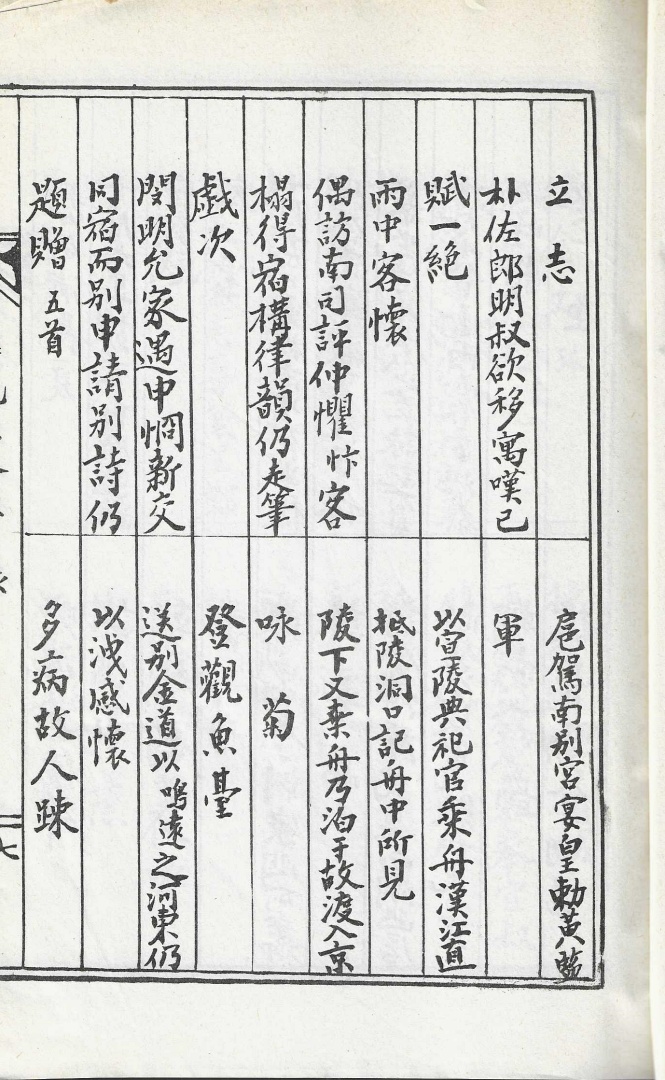 擧目乾坤。修我古今。象弭魚服。貝冑朱綬。於斯乎別有甲兵。異於前所云。非戈戟之耀目。豈旌旆之彗雲。普天之下。卛土之濱。寧邦有物。百萬斯民。苟世君之拊此。任禦侮於同胞。戎不待於詰爾。有自然之戈矛。安之如何。發政施仁。機有餘布。俾也絲身。廩有餘粟。使之穀腹。上怙恃兮下幼弱。計常裕於事育。無一夫之失所。有萬姓之安堵。豈弟君子。民之父母。孰不親上。撫我則后。曰吾君而願戴。盡赤子之攸墍。顧奠民之袵席。有盤石之國勢。堅藏荷笠。利隱把鋤。四境歡歌。萬里軍聲。允矣民斯。非兵而兵。嵒已壯於黎庶。塵自靖於幅員。誰知邊圉之無警。賴畎畝之息肩。是所謂之甲兵。不血刃而萬全。金鱗向日。頓覺無功。雪鍔磨空。竟失其鋒。猗無形之有險。豈觀兵之所及。筭往古之聖君。咸以此而爲國。帝舜敷德。頑苗自格。文王若保。崇密是忽。卻玁狁於勞來。遏巒方於質爾。歧兵民於世降。歎閱武之徒事。民前後之不殊。兵昔今之胡異。秦皇黷武。未免戍卒之叫。漢帝修兵。終致萑蒲之盜。嗟爾世辟。本固邦寧。胡然昧此。民外求兵。藏堅銳於庶民。偉我王之耀德。旣有備於蘇癃。可無畏於禦敵。九重如何。宵旰深憂。顧瞻四方。民亦勞止。盍言加惠。俾厥憂泄。
