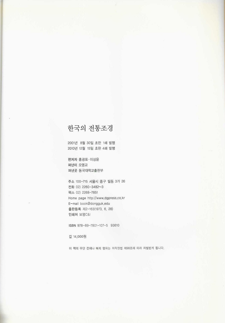 『한국의 전통조경』은 2001년 8월에 초판을 발행했고 2010년 12월에 4쇄 발행을 동국대학교출판부에서 했다. 지은이 홍광표는 동국대학교 조경학과 교수이고, 이상윤은 성균관 대학교 조경학 박사이며, 「한국의 전통조경」을 발행했다.