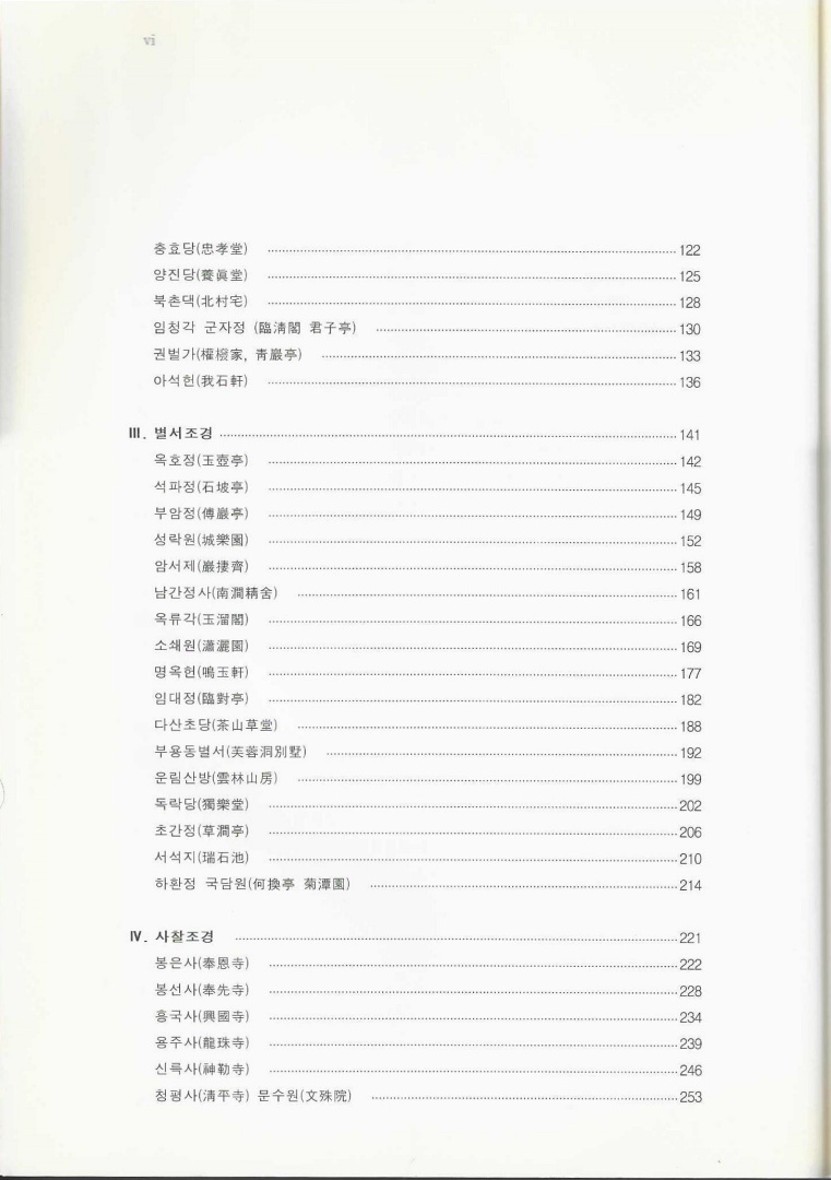 궁남지 ...2 안압지 ...4 포석정 ...11 경복궁 ...13 창덕궁 ...22 창경궁 ...33 덕수궁 ...39 종묘 ...44 2.주택조경공덕귀가 ...50 백인제가 ...53 여경구가 ...55 정용채가 ...58 김영구가 ...61 선교장 ...63 이항희가 ...67 김기응가 ...69 윤증고택 ...72 이도선가 ...76 영암댁 ...80 교수댁 ...85 박인기가 ...89 김동수가 ...92 권희문가 ...96 운조루 ...98 이용욱가 ...103 윤고산고택 ...106 박엽가 ...109 정용준가 ...112 이원용가 ...115 월성 손씨 대종가 ...118 충효당 ...122 양진당 ...125 북촌댁 ...128 임청각 군자정 ...130 권별가 ...133 아석현 ...136 3.별서조경옥호정 ...142 석파장 ...145 부암정 ...149 성락원 ...152 암서제 ...158 남간정사 ...161 옥류각 ...166 소쇄원 ...169 명옥헌 ...177 임대정 ...182 다산초당 ...188 부용동별서 ...192 운림산방 ...199 독락당 ...202 초간정 ...206 서석지 ...210 하환정 국담원 ...214 4.사찰조경봉은사 ...222 봉선사 ...228 흥국사 ...234 용주사 ...239 신륵사 ...246 청평사 문수원 ...253 법주사 ...259 정림사지 ...263 마곡사 ...266 실상사 ...270 미륵사지 ...273 송광사 ...277 선암사 ...283 화엄사 ...293 보림사 ...298 대둔사 ...300 황룡사 ...305 분황사 ...309 불국사 ...314 부석사 ...322 통도사 ...328 해인사 ...337 5.서원조경심곡서원 ...348 돈암서원 ...351 무성서원 ...354 도동서원 ...359 소수서원 ...365 병산서원 ...369 도산서원 ...373 옥산서원 ...380 남계서원 ...383